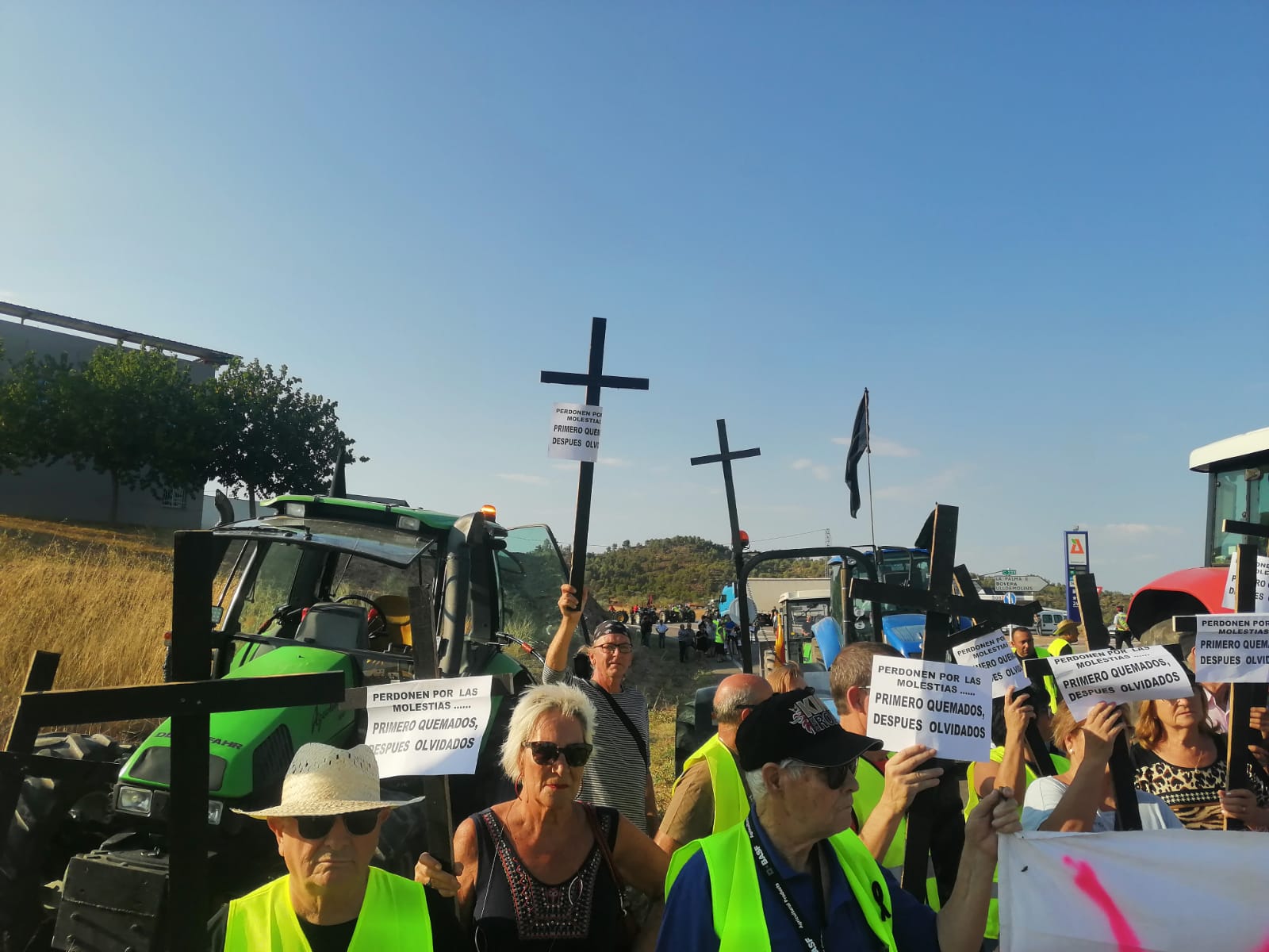 Aquest diumenge, 25 d'agost, els afectats pels focs de la Ribera d'Ebre han tallat de nou la carretera per demanar ajuts per fer front a les pèrdues en les seves explotacions. En cada jornada de protesta, se sumen més manisfestants: avui han estat 300 persones i 25 tractors, que han mostrat prop de mig miler de creus i han repartit ampolles d'oli als conductors afectats pel tall de la carretera C-12.