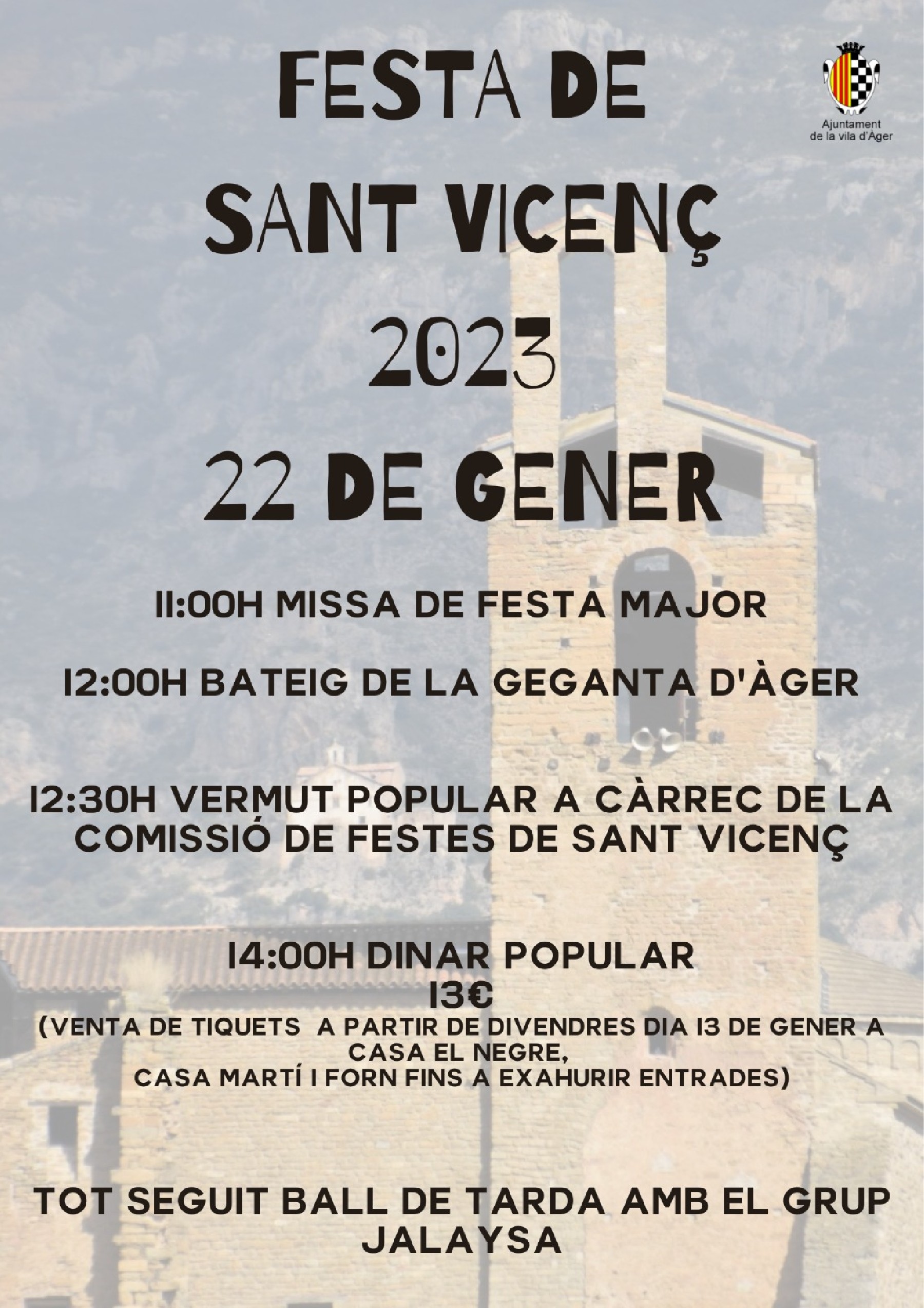 El diumenge, 22 de gener, Àger celebra la Festa de Sant Vicenç, patró del municipi. Una festa de petit format en el que es batejarà la geganta després que aquests dies s'hagi fet una votació popular al municipi per decidir el seu nom. La celebració inaugurarà amb la missa de Festa Major a les 11.00h des de l'Església de Sant Vicenç, l'actual parròquia de la vila, declarada bé d'interès cultural i situada al carrer de Sant Vicent d'Àger.