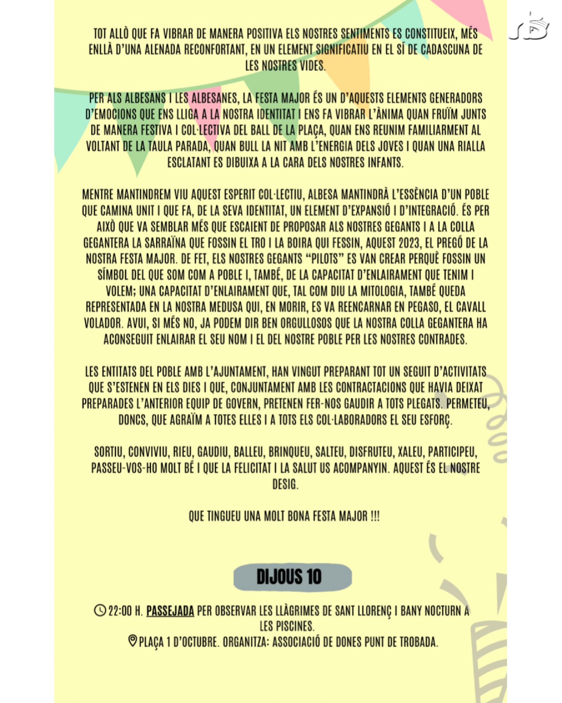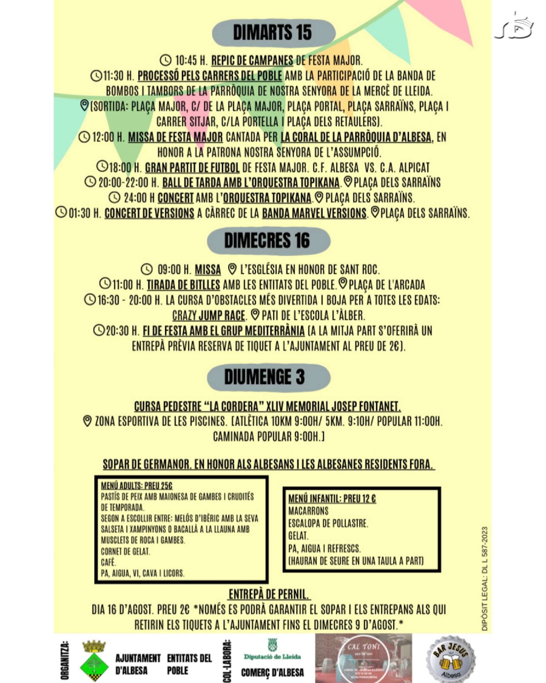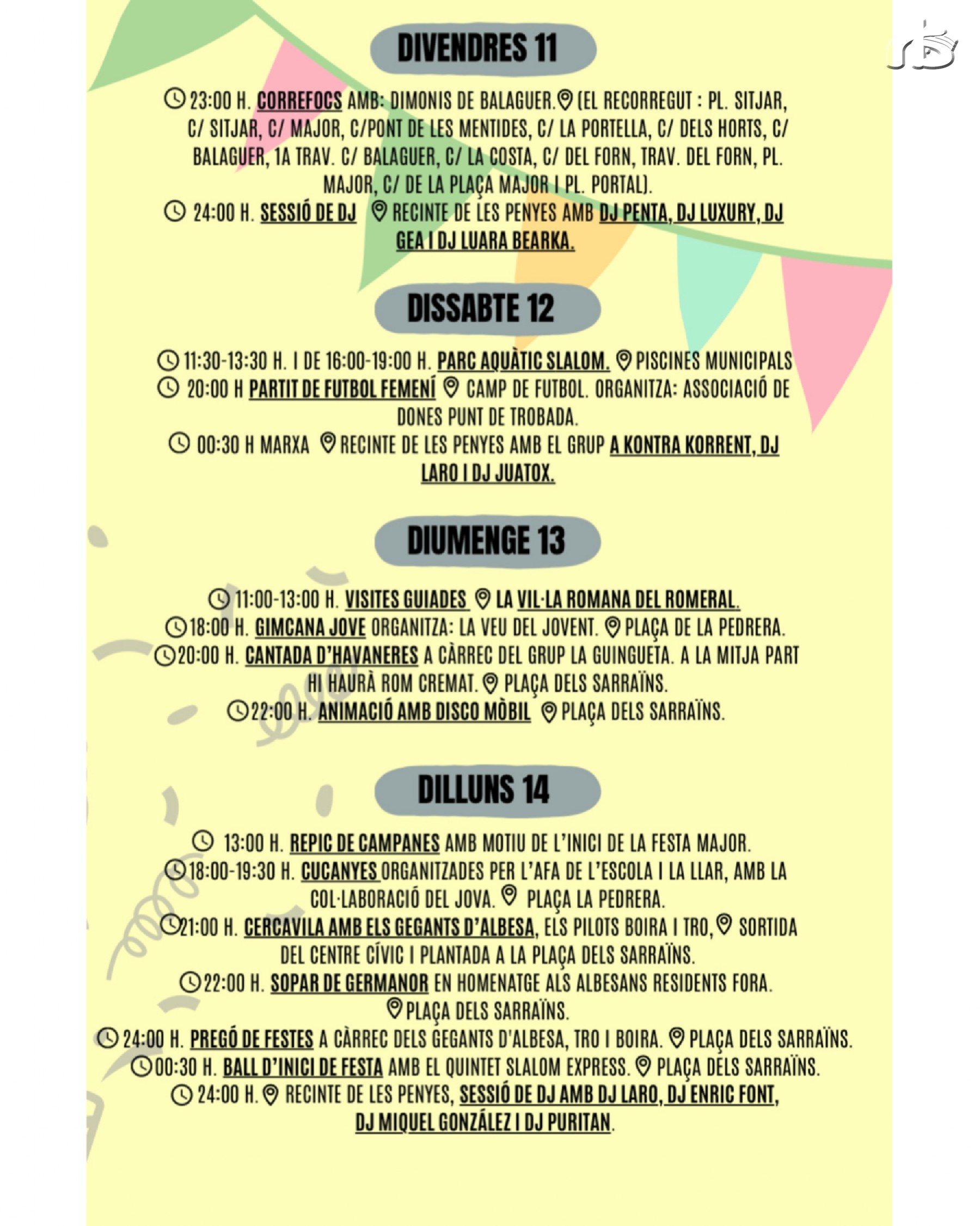 Albesa celebra del 10 al 16 d'agost la festa major. Les sessions amb els djs més sonats del moment i el concert de A Kontra Korrent són els actes més destacats del cartell