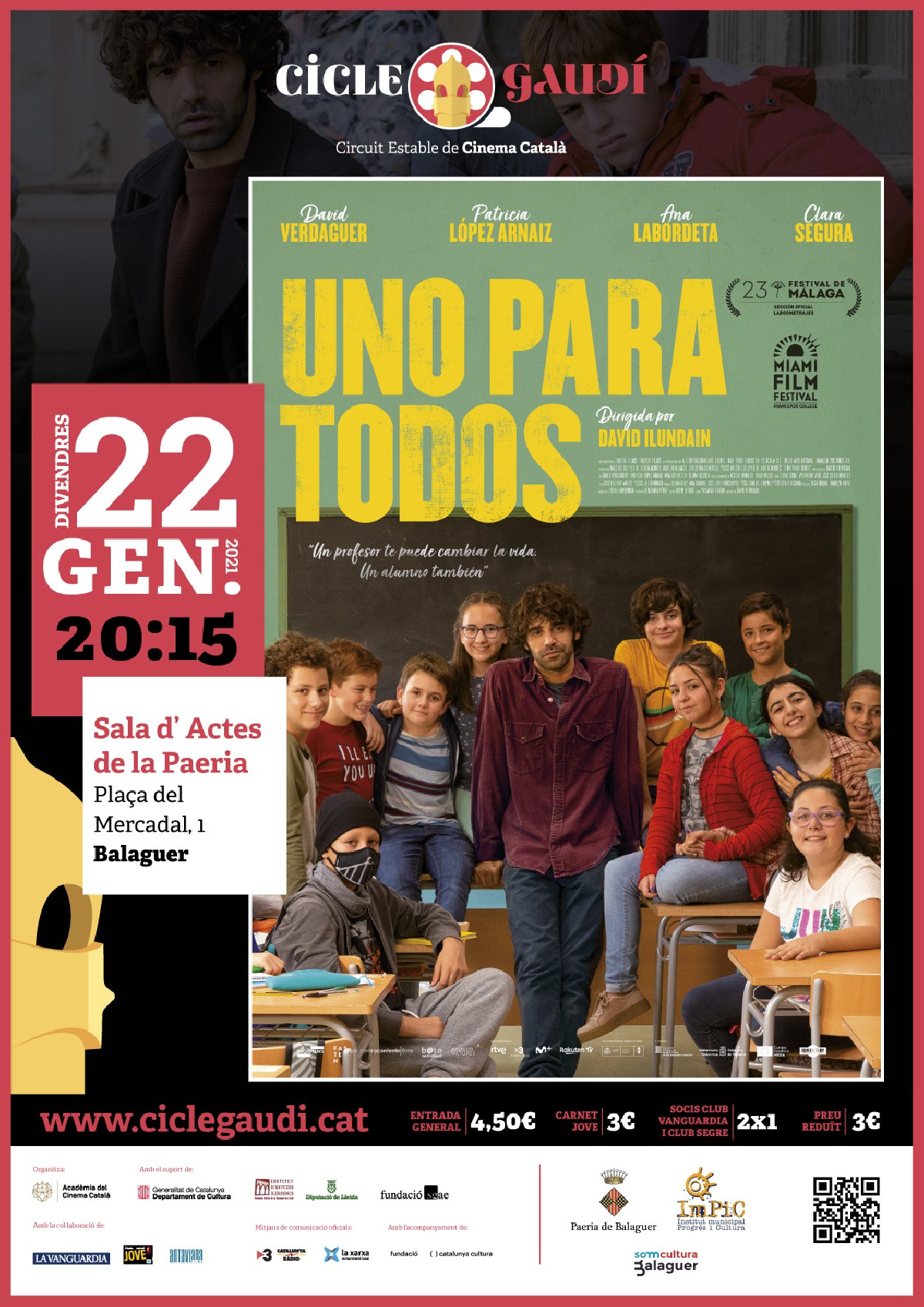 I aquest divendres dia 22 a les 20:15h dins del Cicle Gaudí de Cinema Català es podrà veure al Cinema Balaguer la pel·lícula, Uno para todos, interpretada per David Verdaguer i Clara Segura