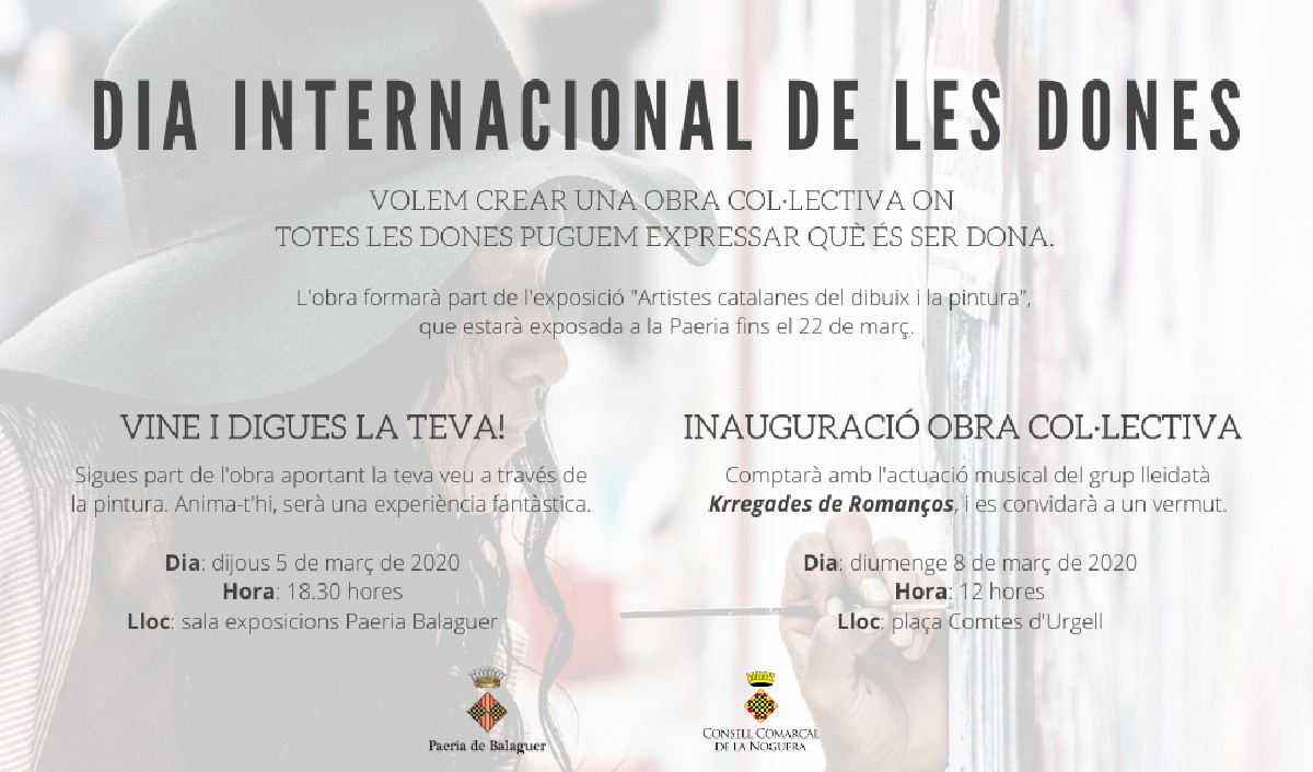 Aquest dijous a les 18.30 h, dins dels actes del Dia Internacional de les Dones a Balaguer es farà l'activitat VINE I DIGUES LA TEVA! amb la creació d'un mural en què totes les dones participants podran expressar què és ser dona!