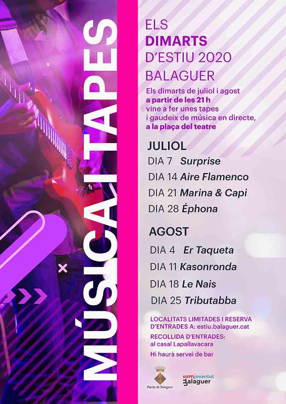 El concert començarà a les 9 de la nit a la plaça del teatre, un espai a l'aire lliure que compleix les condicions sanitàries. L' aforament està limitat a 150 espectadors i, per aquest motiu, cal reserva prèvia a la web estiu.balaguer.cat, i passar a recollir les entrades gratuïtes al casal Lapallavacara.
