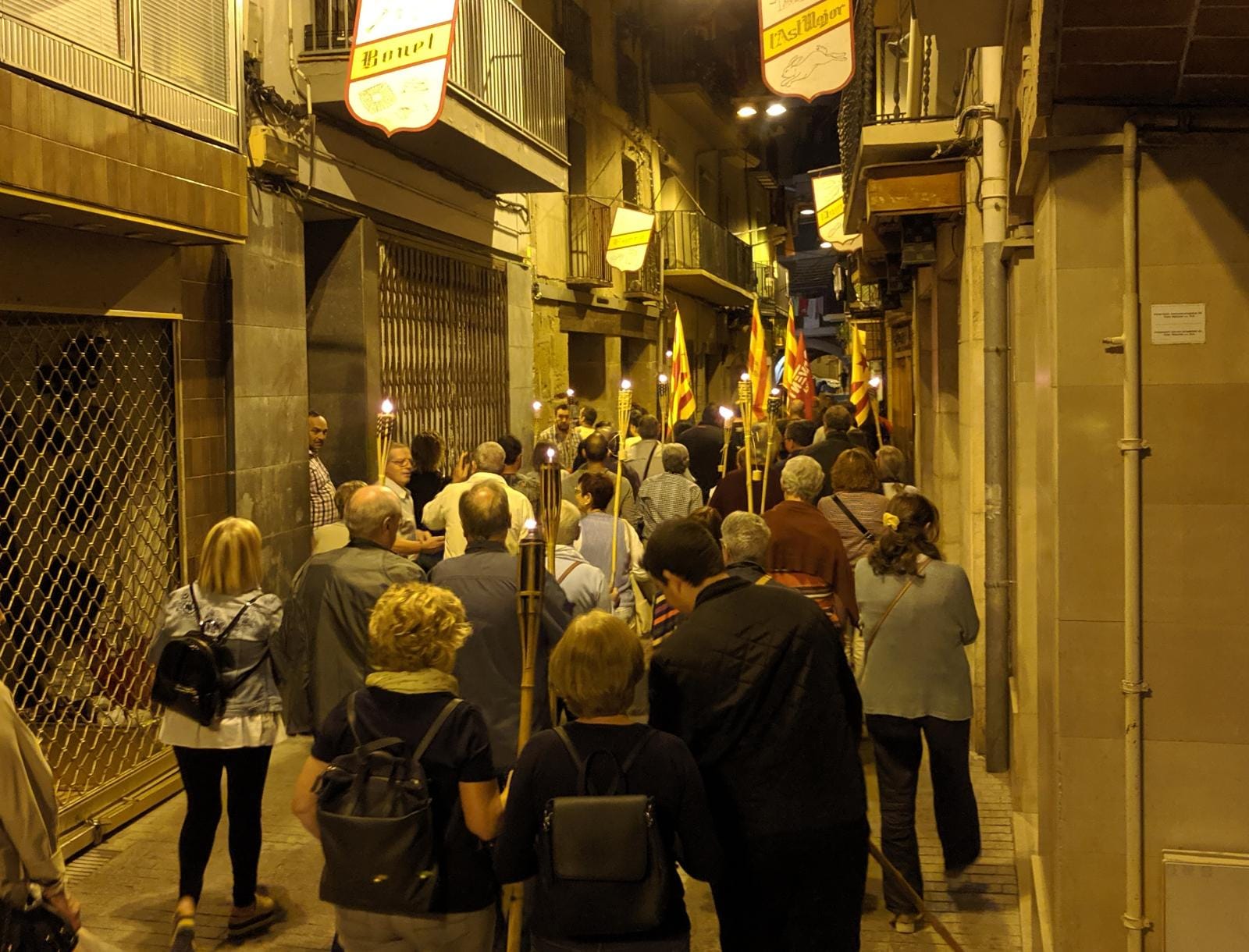 L'acte ha comen´çat amb la concentració a la Plaça de la Sardana per iniciar la marxa de torxes fins a la plaça del Pou. Durant el recorregut els assistents han recorregut el Passeig de l'Estació, el pont Nou i el Mercadal, per arribar via el Carrer Major fins la Plaça del Pou. Durant el recorregut, que ha estat encapçalat pels ritmes de la batukada de l'Escola de Música, s'han fet diverses parades en les que la Colla bastonera del casal Pere III ha ballat diverses cançons.