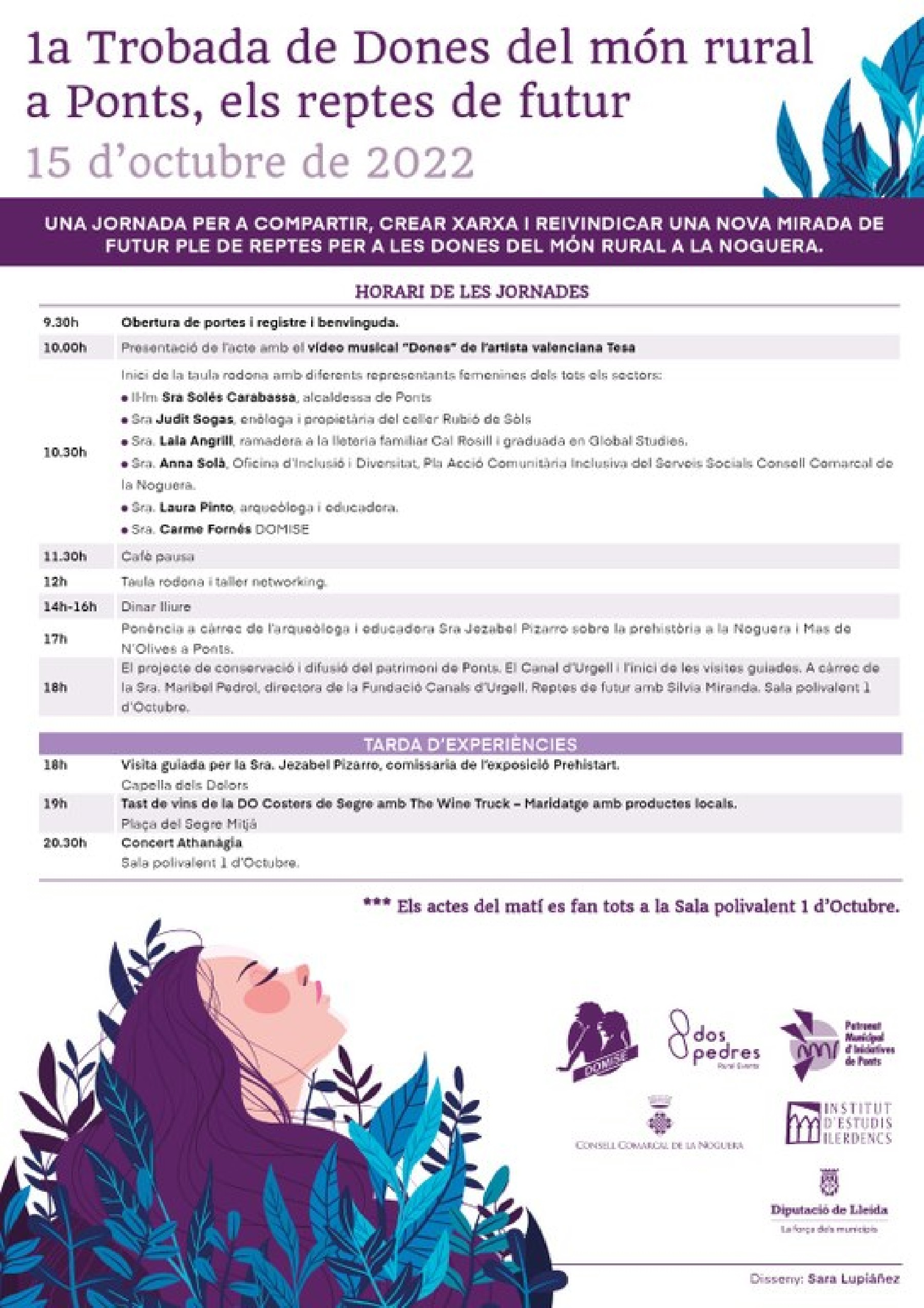 Acte seguit s'iniciarà la primera taula rodona amb diferents representants femenines dels tots els sectors: Solés Carabassa, alcaldessa de Ponts, Judit Sogas, enòloga i propietària del celler Rubio de Sòls, Lala Angrill ramadera a la lleteria familiar Cal Rosill i graduada en Global Studies, Anna Solà, de l'Oficina d'inclusió i Diversitat Pla Acció Comunitària inclusiva del Serveis Socials Consell Comarcal de la Noguera, Laura Pinto, arqueòloga i educadora i Carme Fornés de DOMISE.