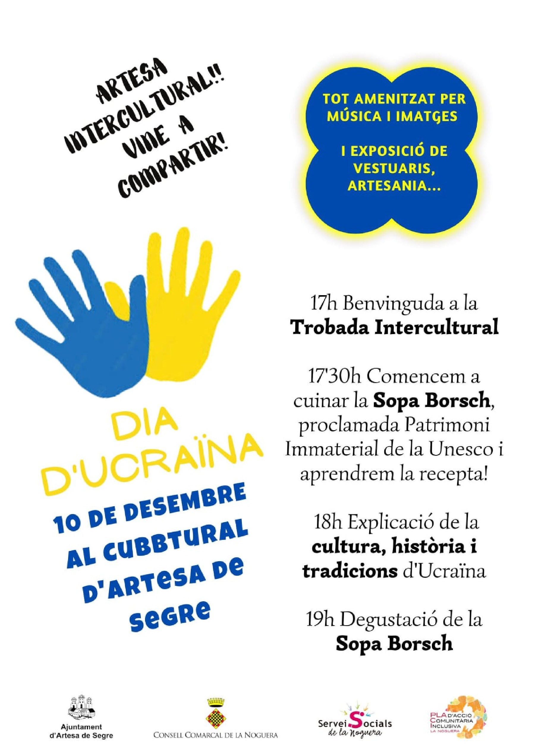 Artesa de Segre també organitza aquest dissabte a la tarda una trobada intercultural pel Dia d'Ucraïna. Es farà al Cubtural a partir de les 5 de la tarda i comptarà amb una mostra de vestits i música típica ucraïnesa, a més de l'elaboració i degustació de la Sopa Borsch, proclamada Patrimoni Immaterial de la Humanitat per la Unesco. També hi haurà una explicació de la història, tradicions i cultira d'Ucraïna.