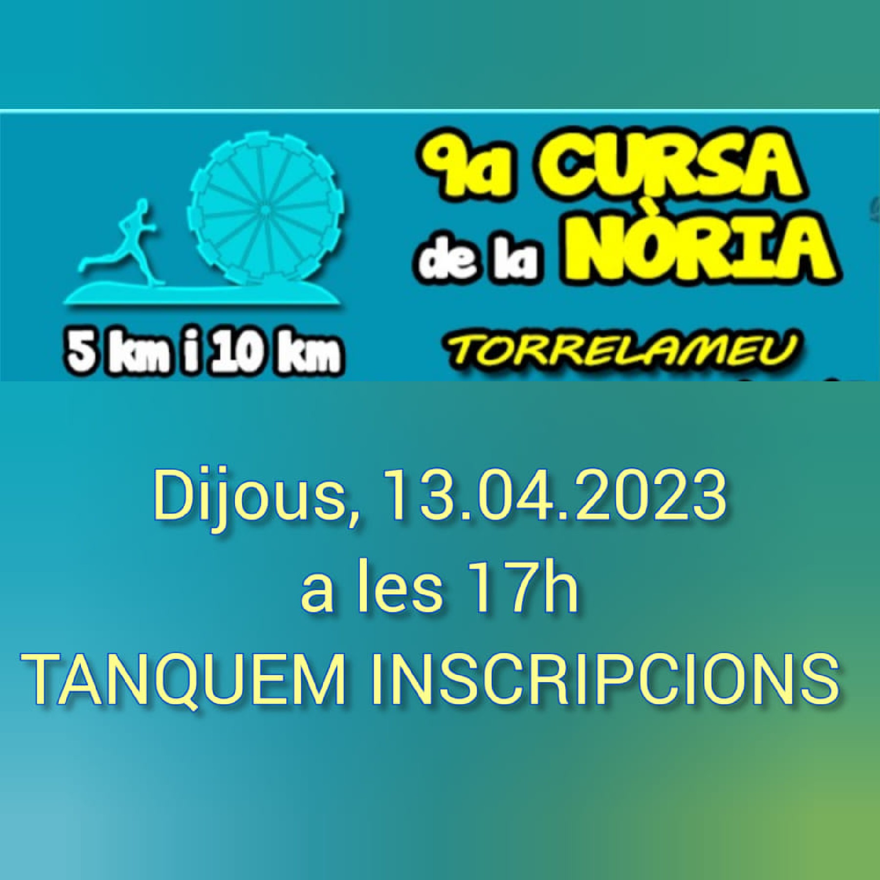 Aquest diumenge dia 16 d'abril se celebrarà la 9a Cursa de la Nòria de Torrelameu. La cursa comptarà amb proves de 5 i 10 km, que són puntuables per la Lliga Ponent i ja compta amb 200 inscrits