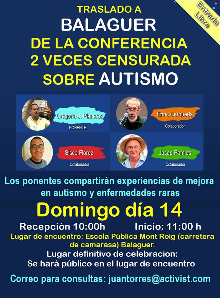 Aquest diumenge es podria celebrar a Balaguer la xerrada per curar l'autisme i que va ser prohibida a Dolça Revolució pel departament de salut. El lloc exacte de la conferencia no és sabrà fins diumenge a les 10