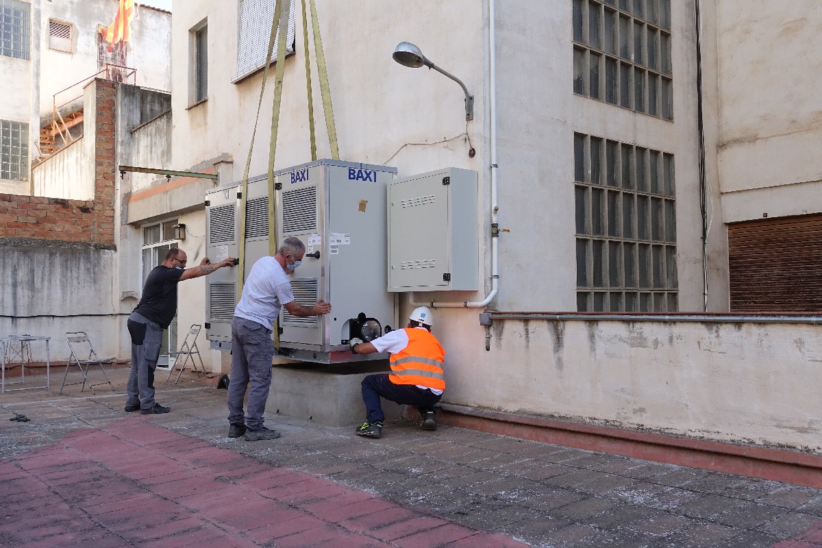 Amb aquesta actuació es preveu la retirada de l'actual caldera de gasoil i la seva substitució per la nova de gas, que no s'ubicarà al soterrani si no que s'instal·la a la terrassa de la 4a planta que es troba a la part de darrera de l'edifici. De fet aquest divendres al matí una grua de grans dimensions ha treballat en l'instal·lació d'aquesta caldera. Concretament ha traslladat la nova caldera des la plaça mercadal fins a darrera de l'edifici.