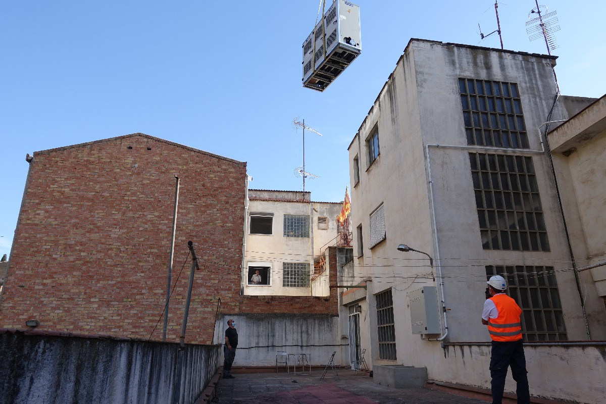 Aquest divendres una grua de grans dimensions ha instal·lat a l'edifici de la Paeria la nova caldera de Gas Natural per a la calefacció de l'edifici. Substitueix l'antic sistema de Gasoil i representarà un estalvi energètic per al consistori