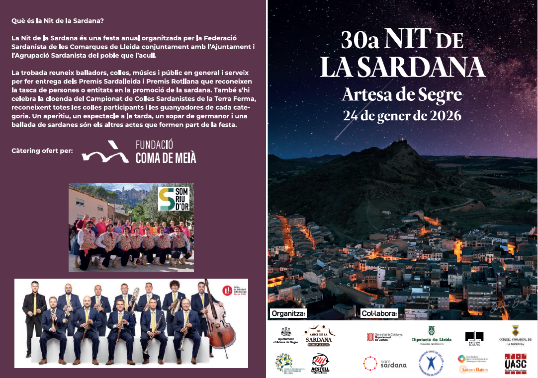 Artesa de Segre acollirà la 30a edició de la Nit de la Sardana, la gran festa del sardanisme lleidatà, que tindrà lloc dissabte 24 de gener de 2026, a partir de les 17:30 h, al Cubtural i al Poliesportiu Municipal d’Artesa de Segre.