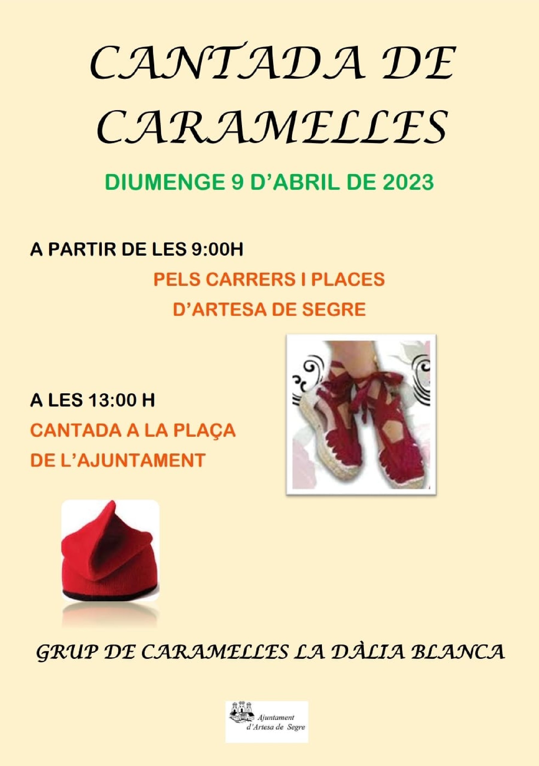 El diumenge tornen les cantades de Caramelles i enguany es podran escoltar pels carrers d'Artesa de Segre durant tot el matí. A la 1 del migdia es farà la cantada final a la plaça de l'ajuntment, gràcies al Grup de Caramelles la Dàlia Blanca.