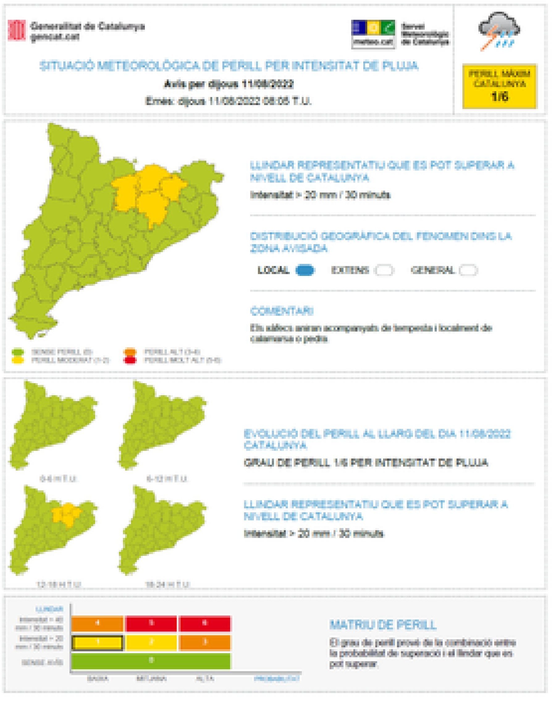 El Servei Meteorològic de Catalunya (SMC) ha emès aquest dijous un avís de situació de perill per la calor que tindrà una afectació extensa al territori fins fins dissabte a la tarda. La temperatura màxima podrà pujar aquest divendres entre 3 i 5 ºC respecte a aquest dijous, sobretot a trams del litoral i prelitoral central i nord. Aquí bufarà vent eixut de component sud-oest i se superaran els 36 ºC. A la depressió central, es podran superar de forma extensa els 38 ºC. Paral·lelament, el Servei Meteorològic ha emès un avís de situació de perill per intensitat de pluja també fins dissabte, amb afectació local al Berguedà, Osona, el Ripollès i la Garrotxa. Es podran superar els 20 mm de precipitació en mitja hora.