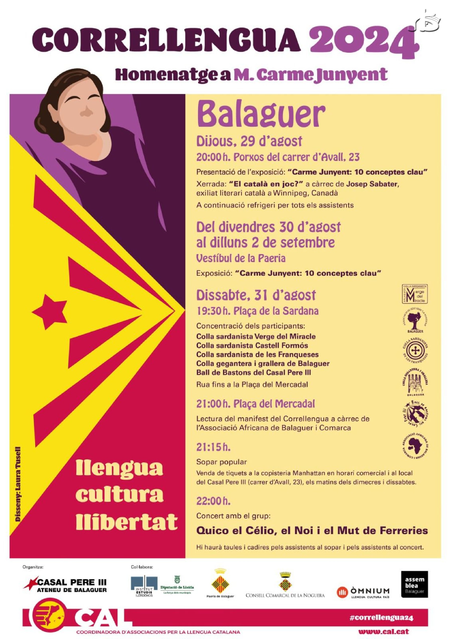 Balaguer acull aquest dissabte una nova edició del CORRELLENGUA. Aquest any estarà dedicat a la figura de la lingüista i escriptora M. Carme Junyent i comptarà entre d'altres amb l'actuació del grup Quico el Célio, el Noi i el Mut de Ferreries
