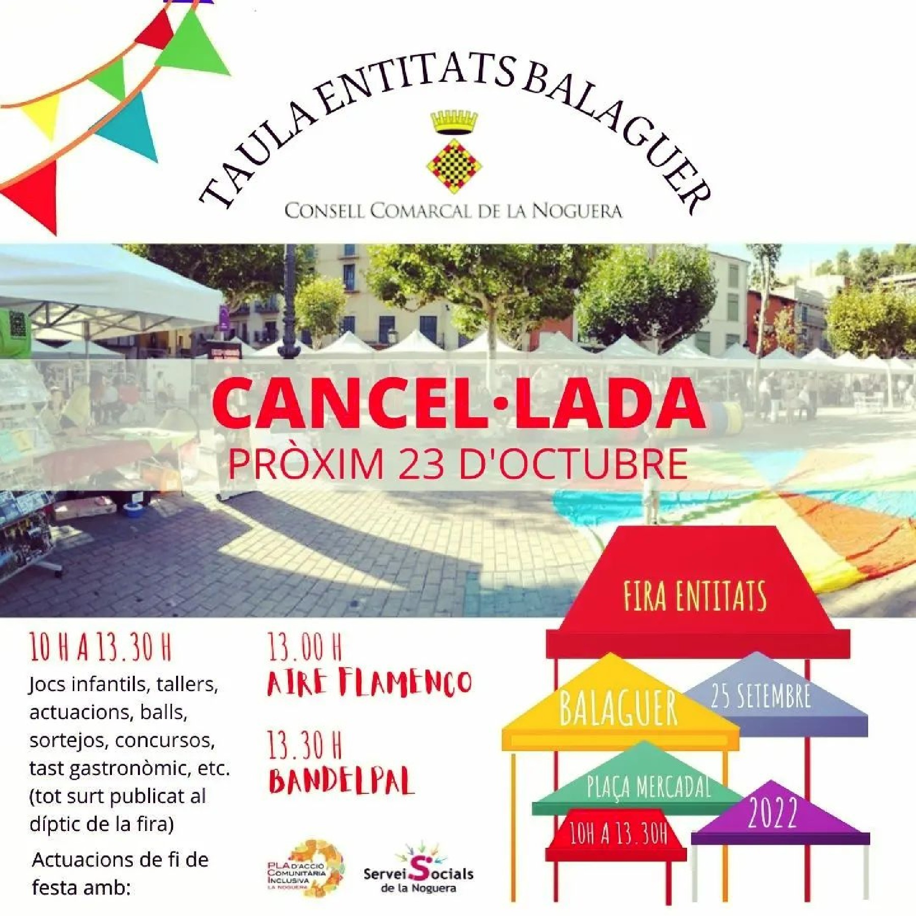 La Taula d'Entitats de Balaguer ha decidit ajornar al 23 d'octubre la Fira d'Entitats prevista per aquest diumenge 25 de setembre per motius meteorològics, per les previsions de pluja.