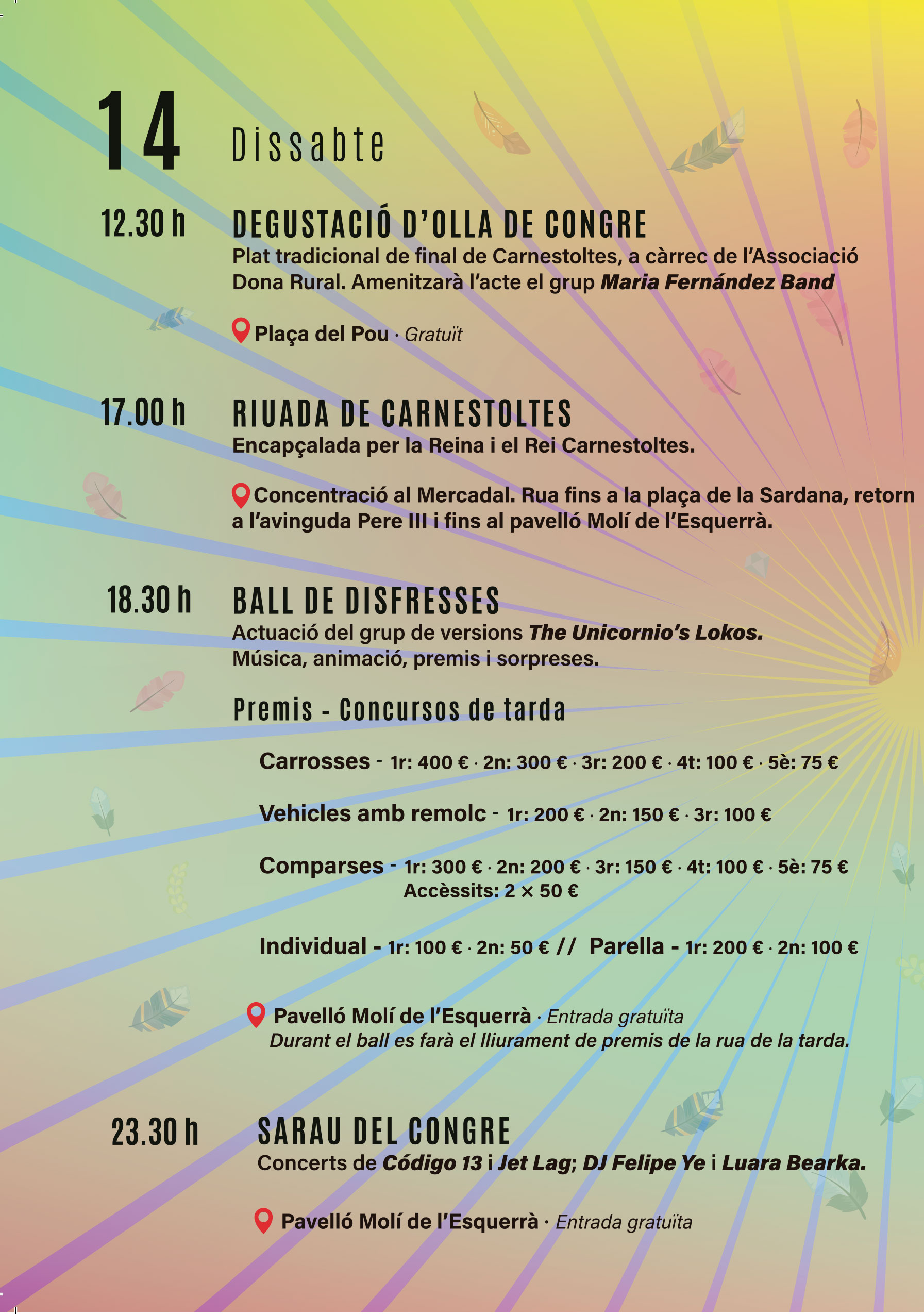Pel que fa al concert de nit, a partir de dos quarts de dotze al mateix pavelló Molí de l’Esquerrà, es farà el Sarau del Congre, amb un concert de la mà del grup de versions Código 13, Jet Lag i els discjòqueis Felipe Ye i Luara Bearka.
