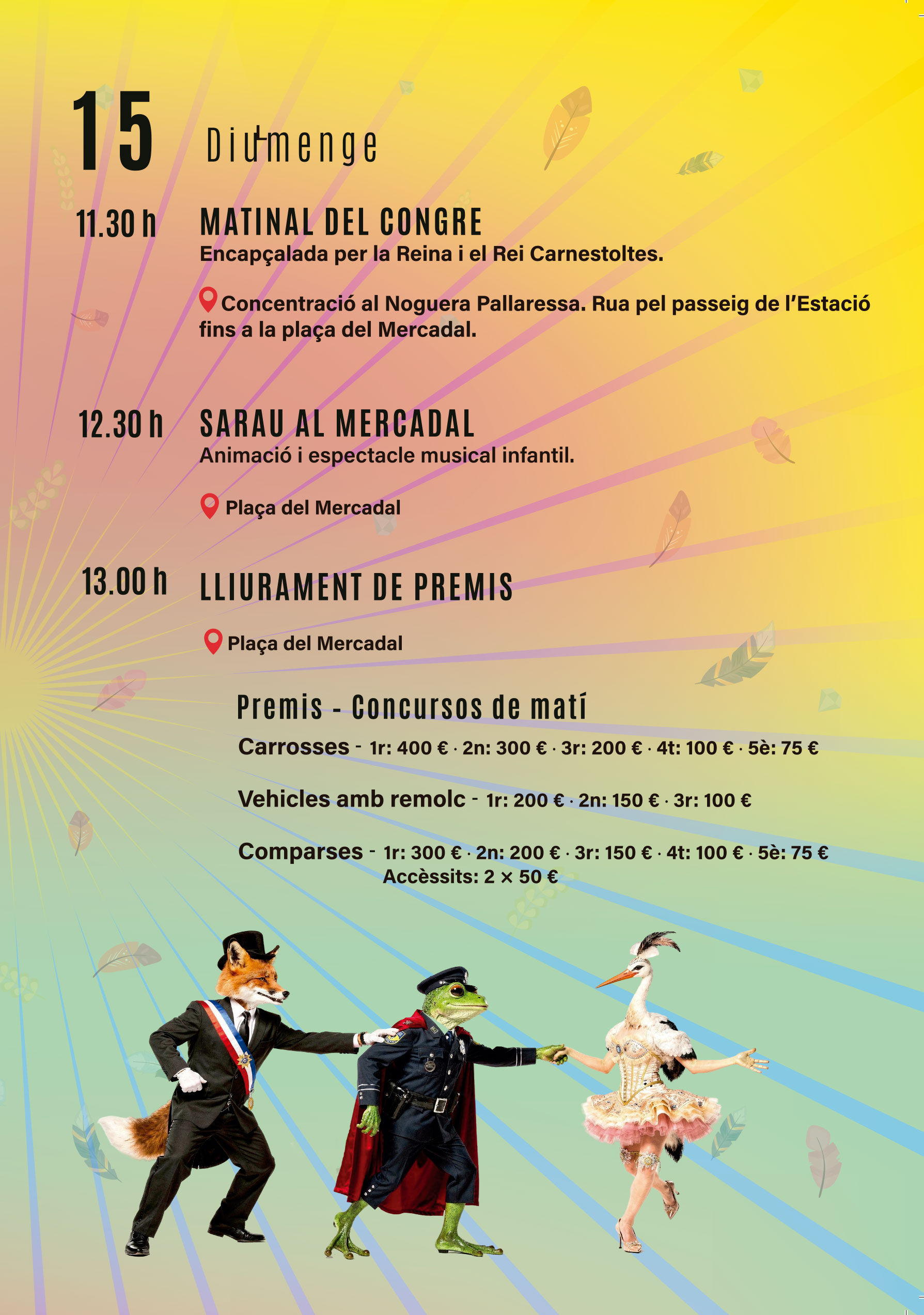 L’endemà diumenge a partir de dos quarts de dotze del migdia es farà la Matinal del Congre, amb una rua de carrosses, vehicles amb remolc i comparses. Sortirà des del carrer Noguera Pallaresa i recorrerà el passeig fins la plaça del Mercadal, on hi haurà un grup d’animació infantil. Finalment, a partir de la 1 del migdia es farà el lliurament de premis.