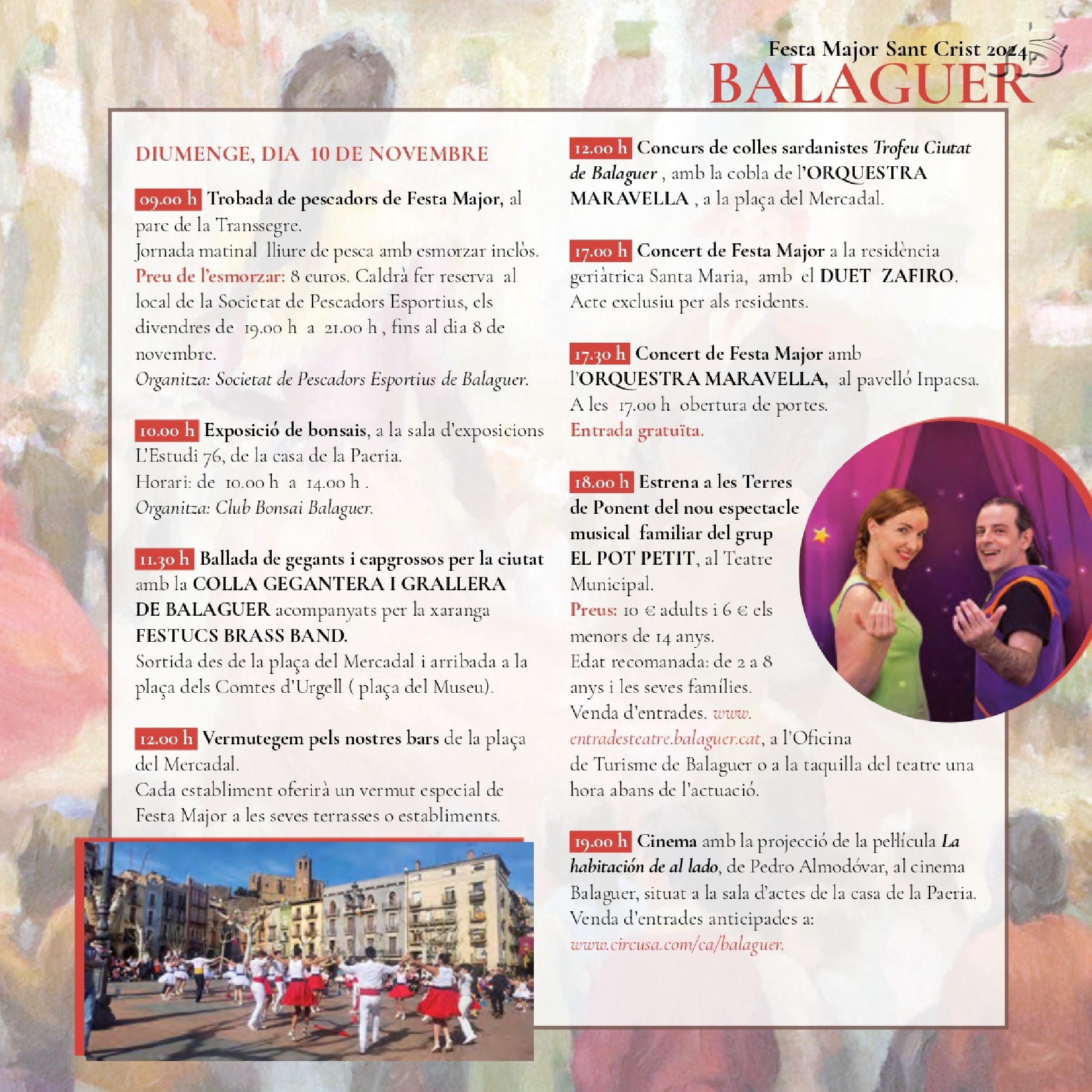 El diumenge dia 10 de novembre la jornada començarà amb la Trobada de pescadors al parc de la Transsegre a partir de les nou del matí. A dos quarts de dotze, i amb sortida des de la plaça del Mercadal i arribada a la plaça Comtes d'Urgell, es farà la ballada a càrrec de la colla Gegantera i Grallera de Balaguer acompanyats de la xaranga Festucs Brass Band i a les dotze començarà el Concurs de colles sardanistes Trofeu Ciutat de Balaguer amb l'orquestra Maravella.