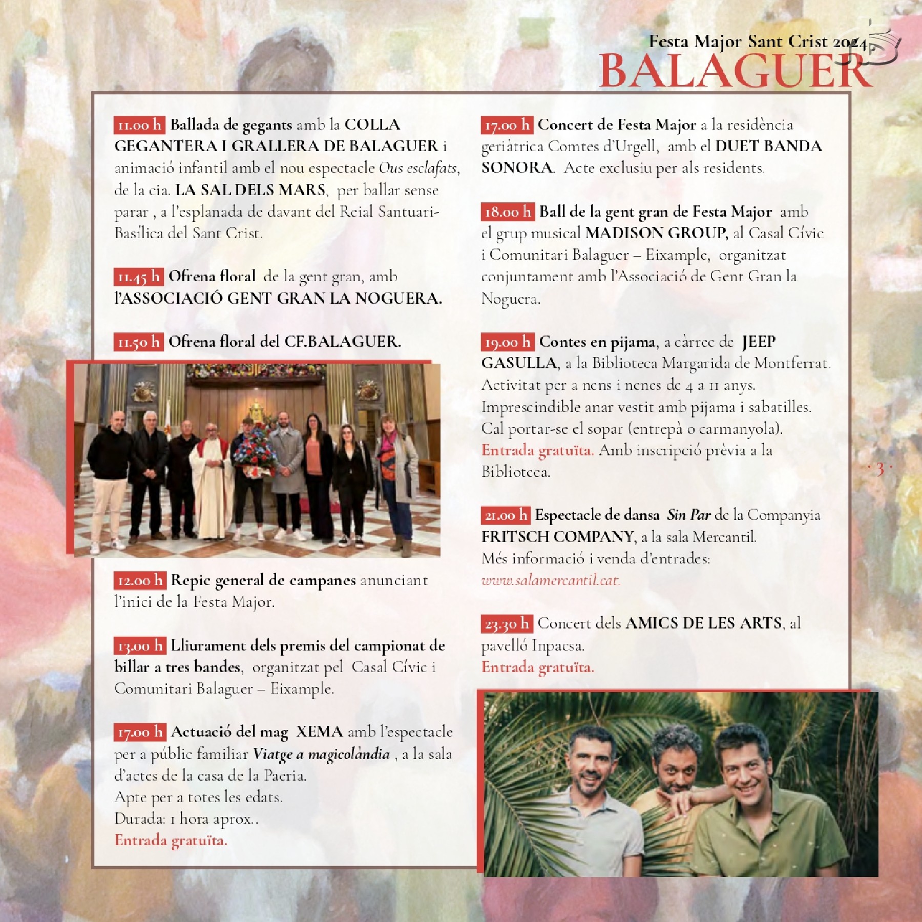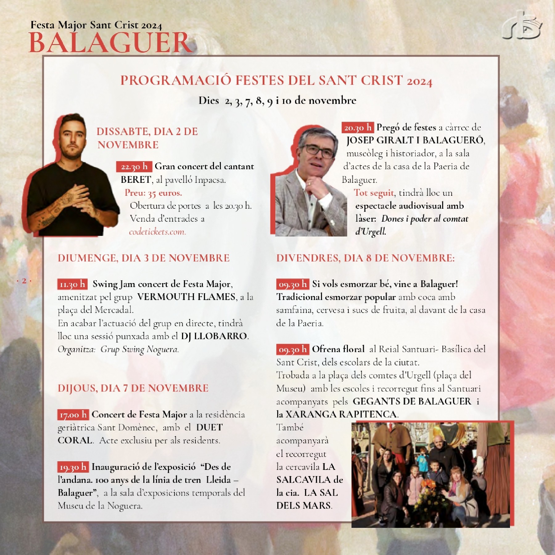 Demà dissabte, 9 de novembre, la jornada començarà amb la sortida de la corporació municipal des de la Casa de la Paeria, que acompanyats dels gegants de Balaguer i la cobla Selvatana, aniran fins la basílica- santuari del Sant Crist per assistir a la missa solemne. Seguidament, la comitiva baixarà cap a la plaça del Pou en direcció a la plaça del Mercadal. Allà ballaran els Gegants i també l'Harpia acompanyats de la cobla Selvatana. Tot seguit es farà un vermut popular i tindrà lloc també la ballada de la Galop de Balaguer, que obrirà la paera en cap.