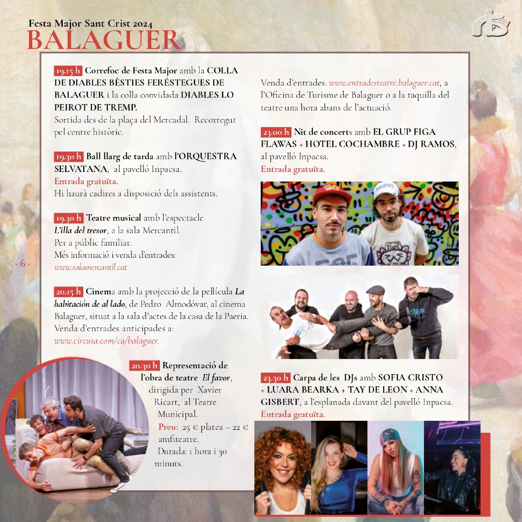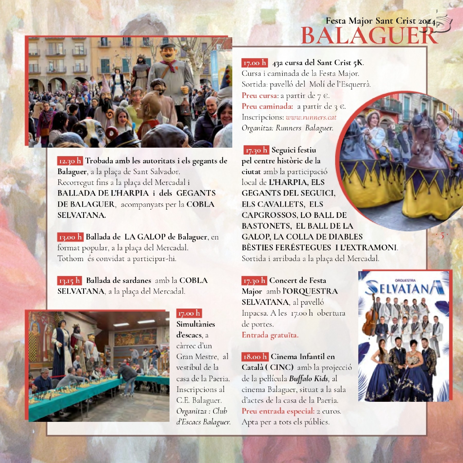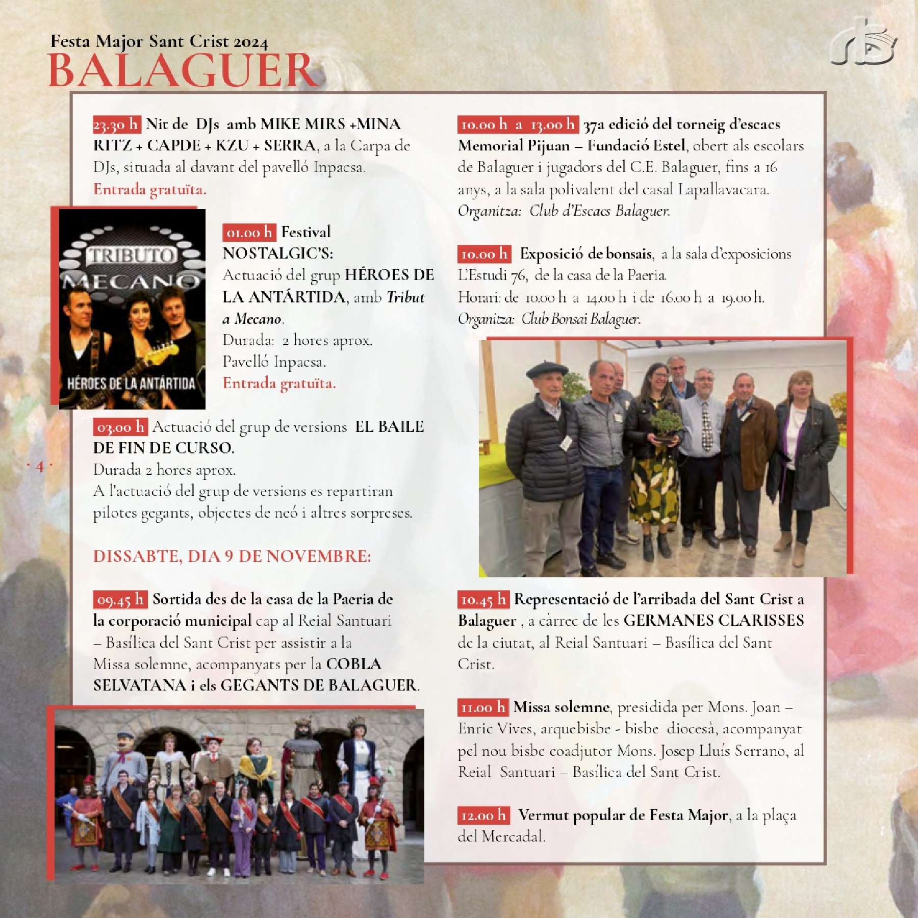 Fins diumenge hi ha previstes moltes més activitats per a totes les edats i gustos sent el dia gran aquest dissabte, 9 de novembre, dia del Sant Crist, dia del Patró de Balaguer.