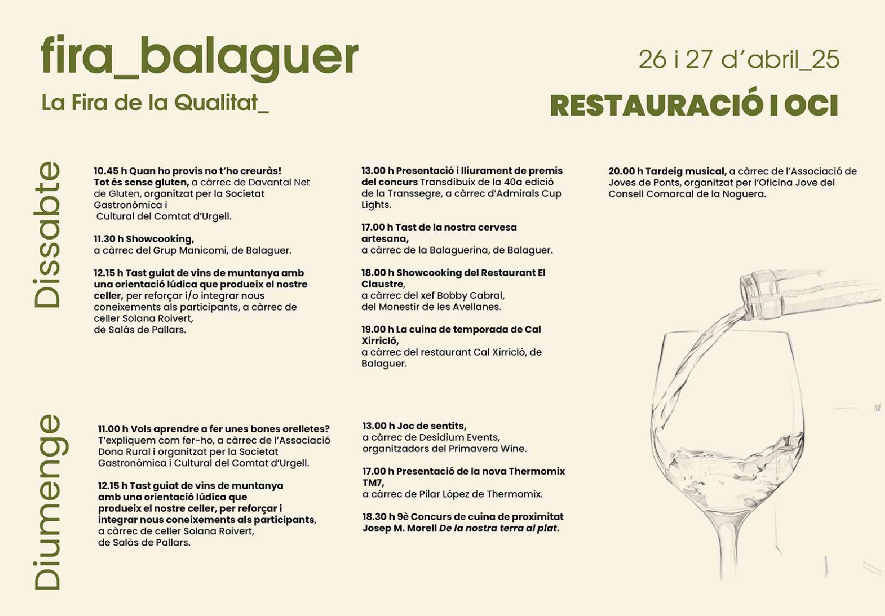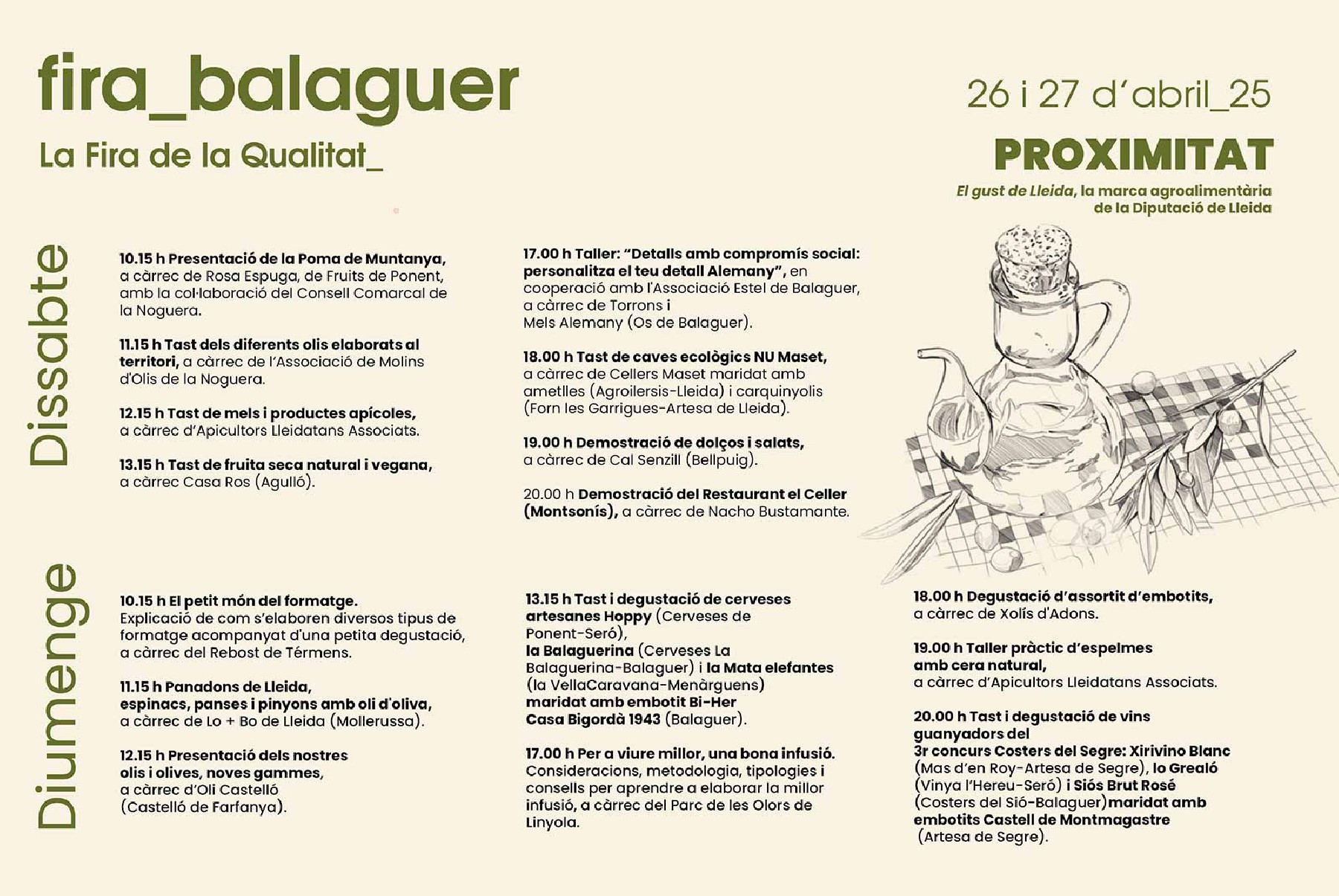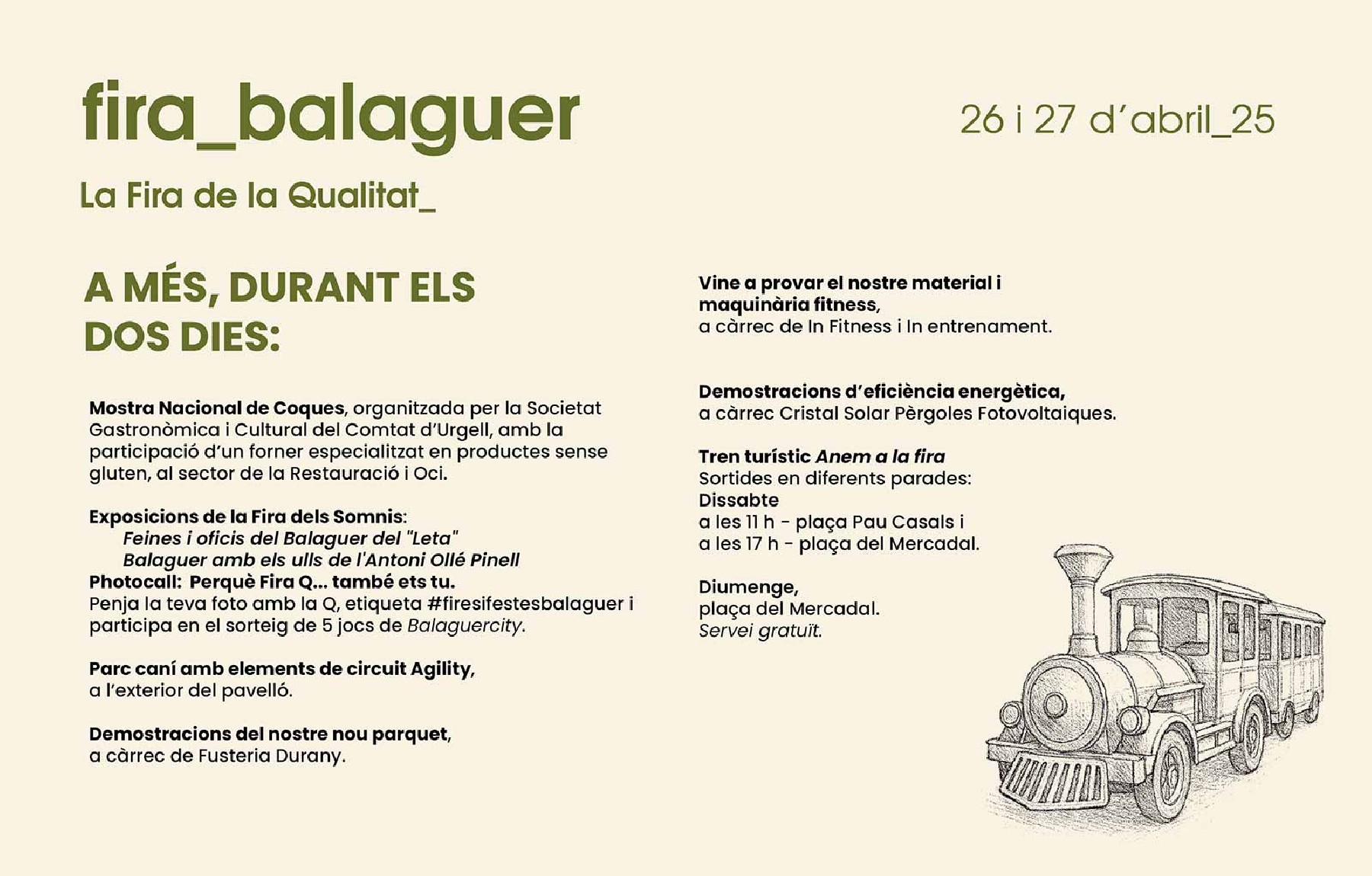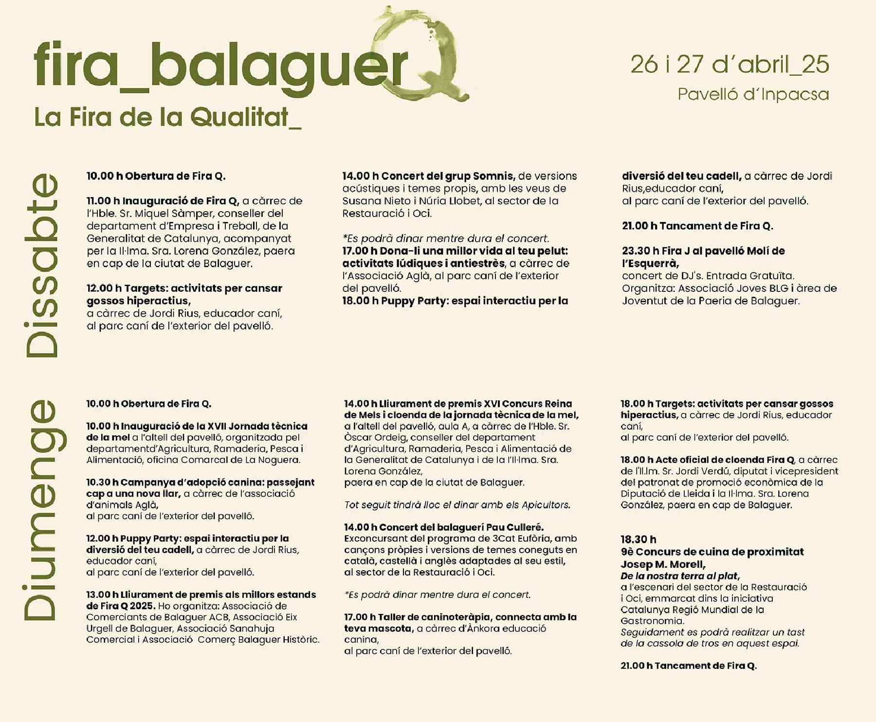 Balaguer celebrarà el cap de setmana del 26 i 27 d'abril una nova edició de Fira Q, un certamen que tornarà a convertir la ciutat en l'aparador dels principals sectors econòmics de la Noguera i del conjunt de les terres de Lleida. Enguany, el certamen es desenvoluparà en el marc de Catalunya com a Regió Mundial de la Gastronomia 2025, fet que donarà una rellevància especial al sector alimentari i gastronòmic, destacant la qualitat i la diversitat dels productes de proximitat.