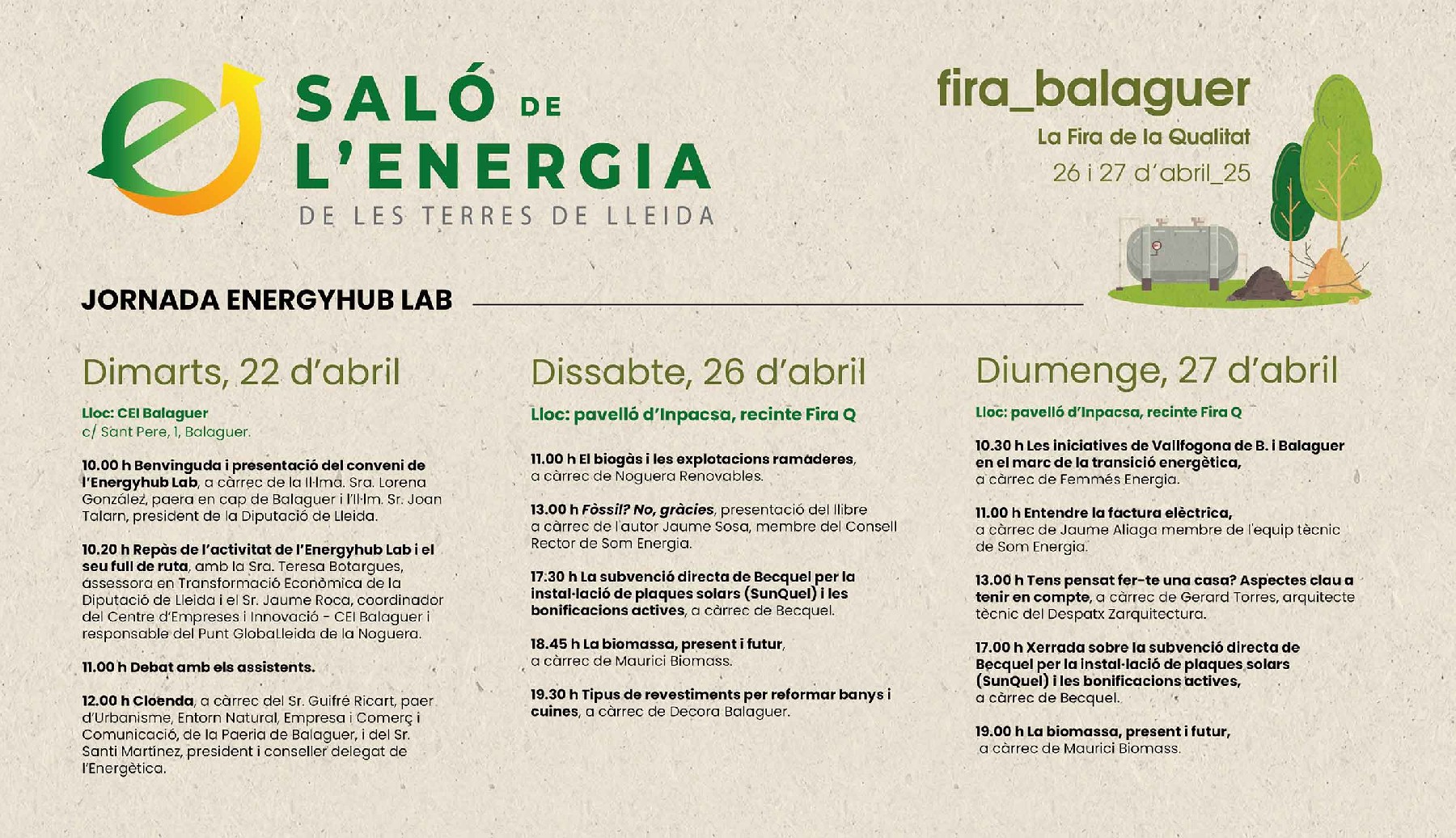 La fira també disposarà del Saló de l'Energia i l'Eficiència Energètica, coordinat pel CEI, l'Energy Hublab i l'Oficina de Transició Energètica de la Noguera, que oferirà diverses xerrades sobre sostenibilitat i noves tecnologies aplicades a l'estalvi energètic.