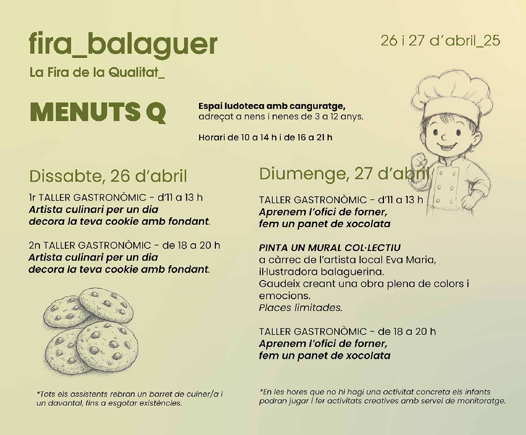 Per als més petits, la Fira Q comptarà amb l'espai Menuts Q, una ludoteca amb monitoratge on es faran tallers gastronòmics, manualitats i activitats infantils durant tot el dia, situada dins l'espai de productes de proximitat.