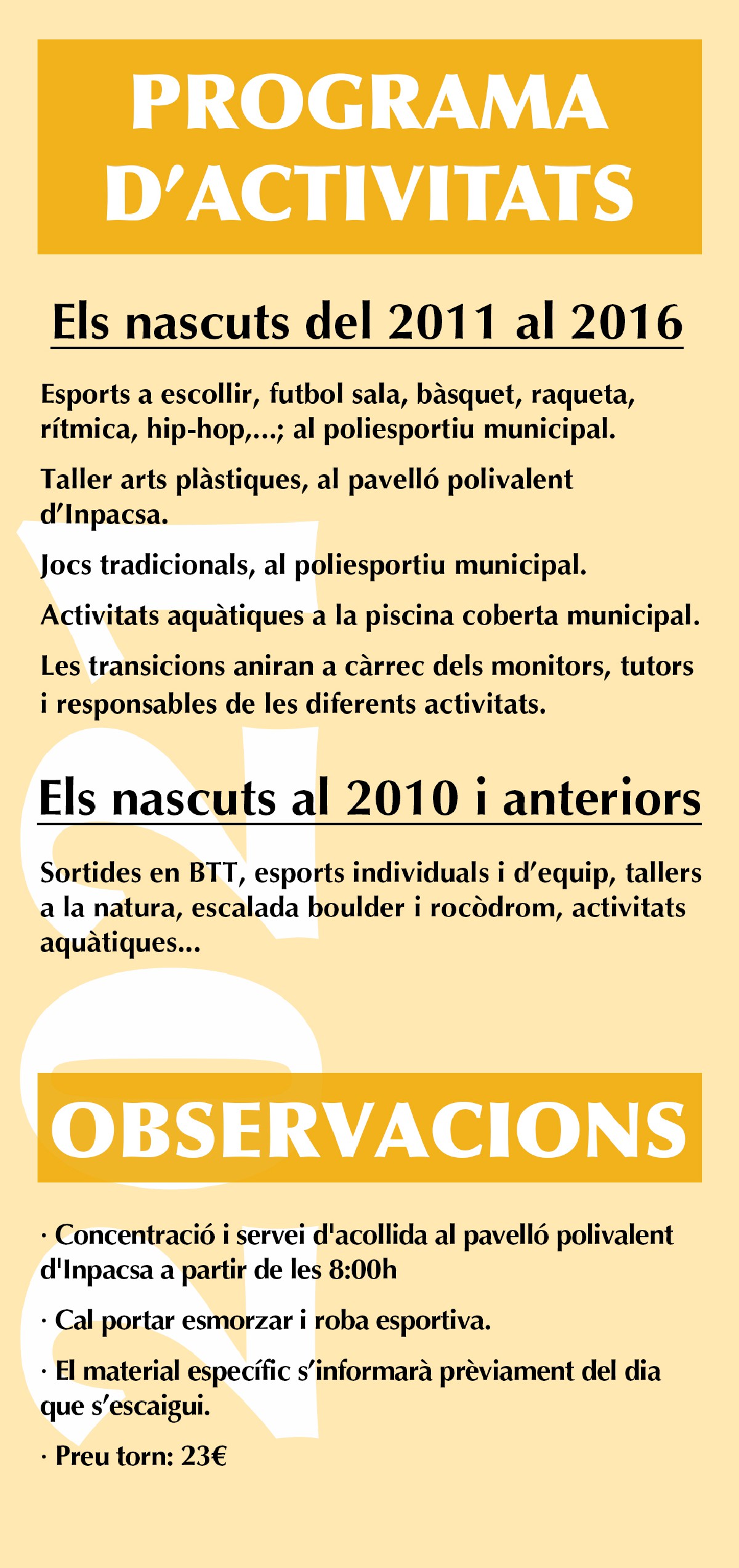 Les activitats es diferenciaran en dos grups; els nascuts del 2011 al 2016, que participaran en activitats plàstiques i manualitats, amb activitats esportives variades i finalment, amb un programa específic d'activitats aquàtiques, tot en les instal·lacions municipals.