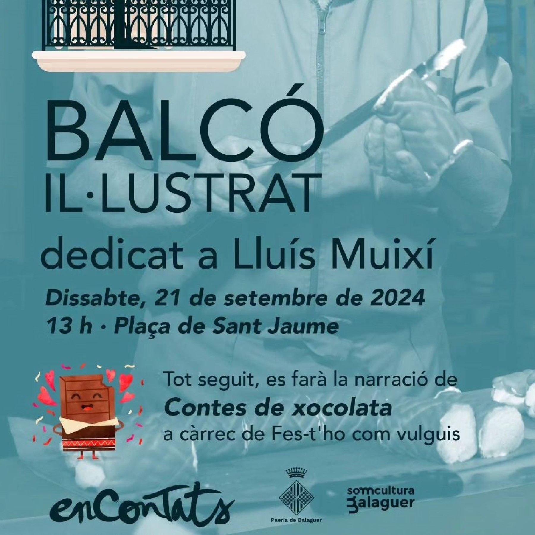 El mural és obra de l'artista Núria Riba i està ubicat a l'inici del carrer Escala, a pocs metres del local que va acollir la Pastisseria Muixí en els seus inicis, entre el carrer d'Avall i la plaça Sant Jaume. Aquest nou Balcó il·lustrat s'ha dedicat al desaparegut pastisser, un balaguerí molt conegut per tothom, i que va portar les seves famoses figures de xocolata de grans dimensions arreu de l'Estat. Justament dues d'aquestes figures són les protagonistes del mural: Salvador Dalí i la Sagrada Família. La inauguració es farà en el marc de l'Encontats, el proper dissabte 21 de setembre a les 13h, on després de la inauguració tindrà lloc la narració de Contes de xocolata, a càrrec de Fes-t'ho com vulguis.