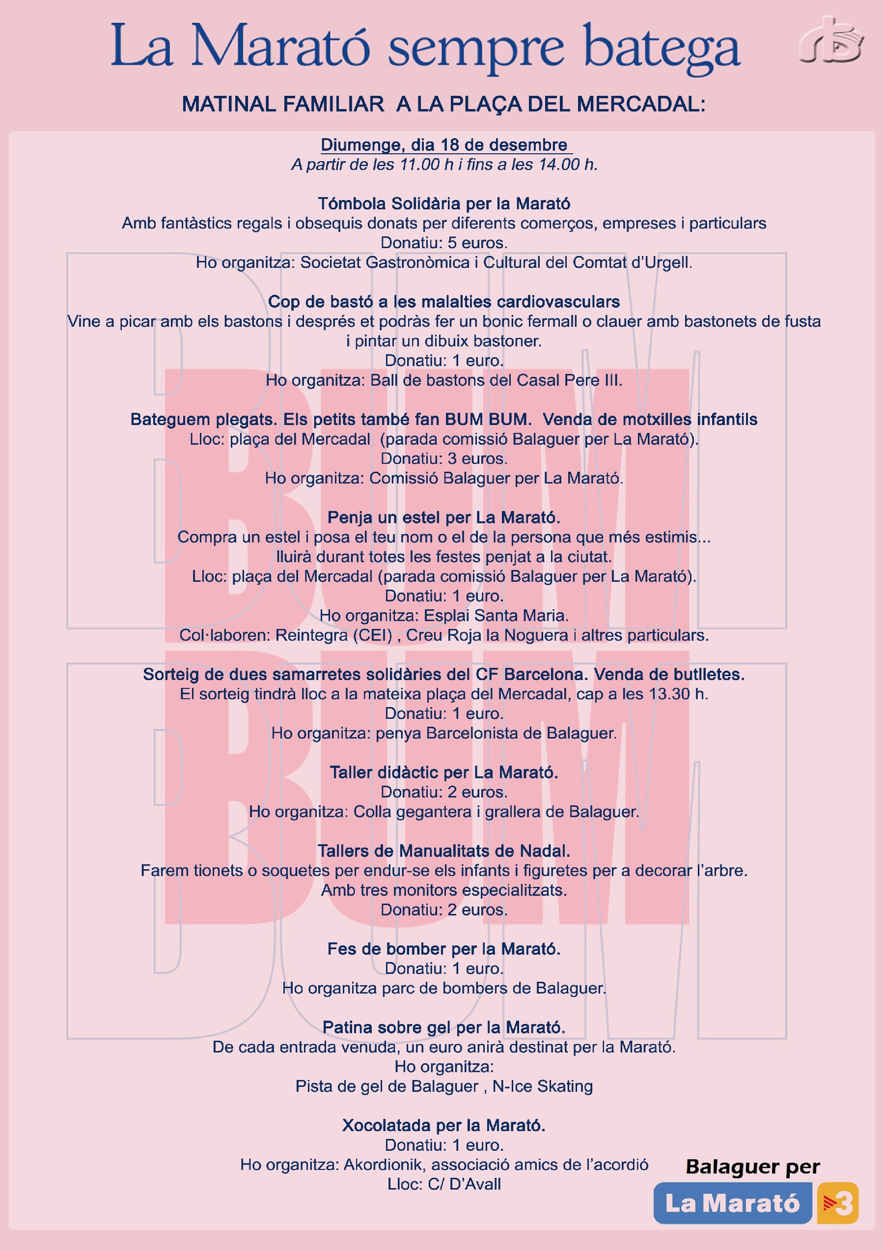 La Comissió Balaguer per La Marató realitzarà l'activitat 'Bateguem plegats. Els petits també fan Bum Bum. Venda de motxilles infantils'. Una activitat amb un donatiu de 3 euros. Aquestes motxilles es poden trobar també en diferents comerços de Balaguer.