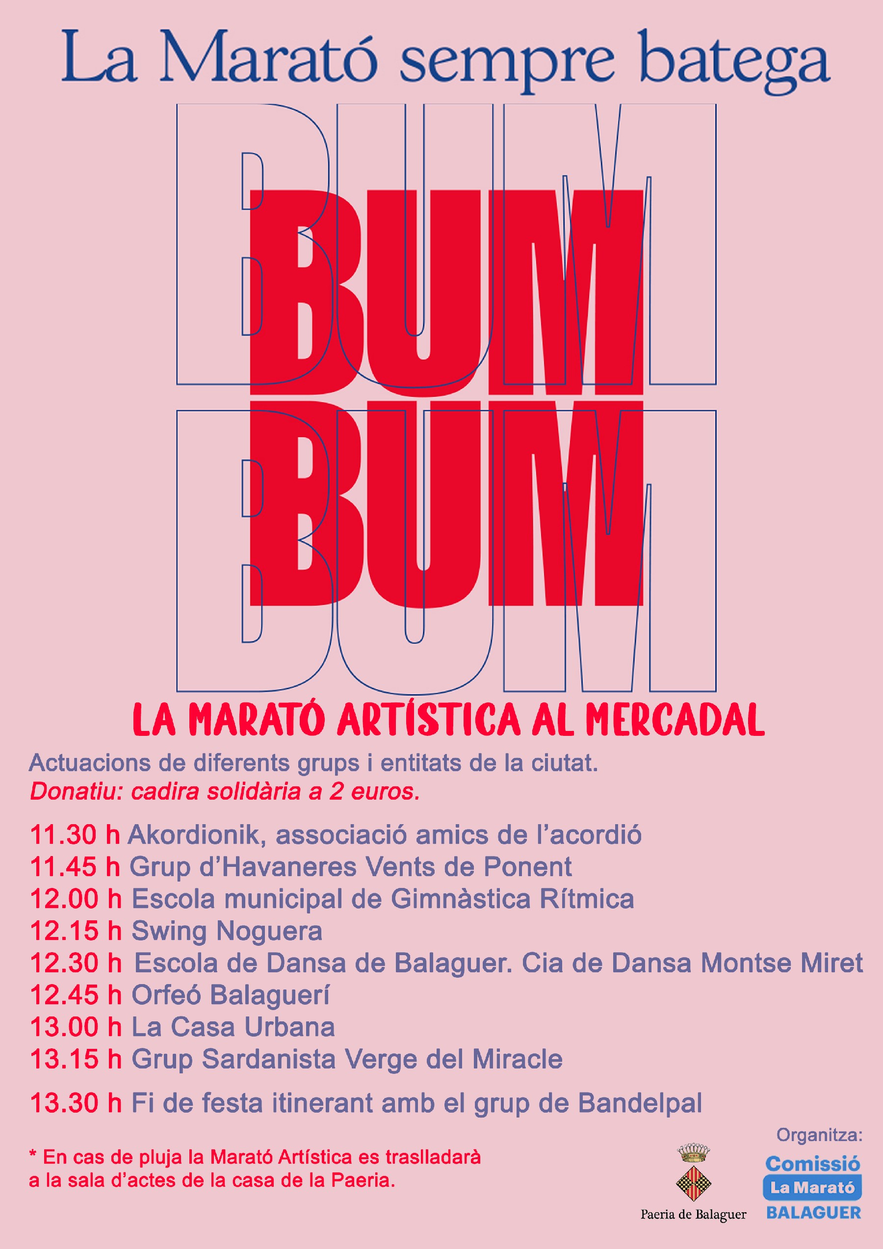 En cas de pluja, totes les actuacions de La Marató Artística es traslladaran a la sala d'actes de la casa de la Paeria.
