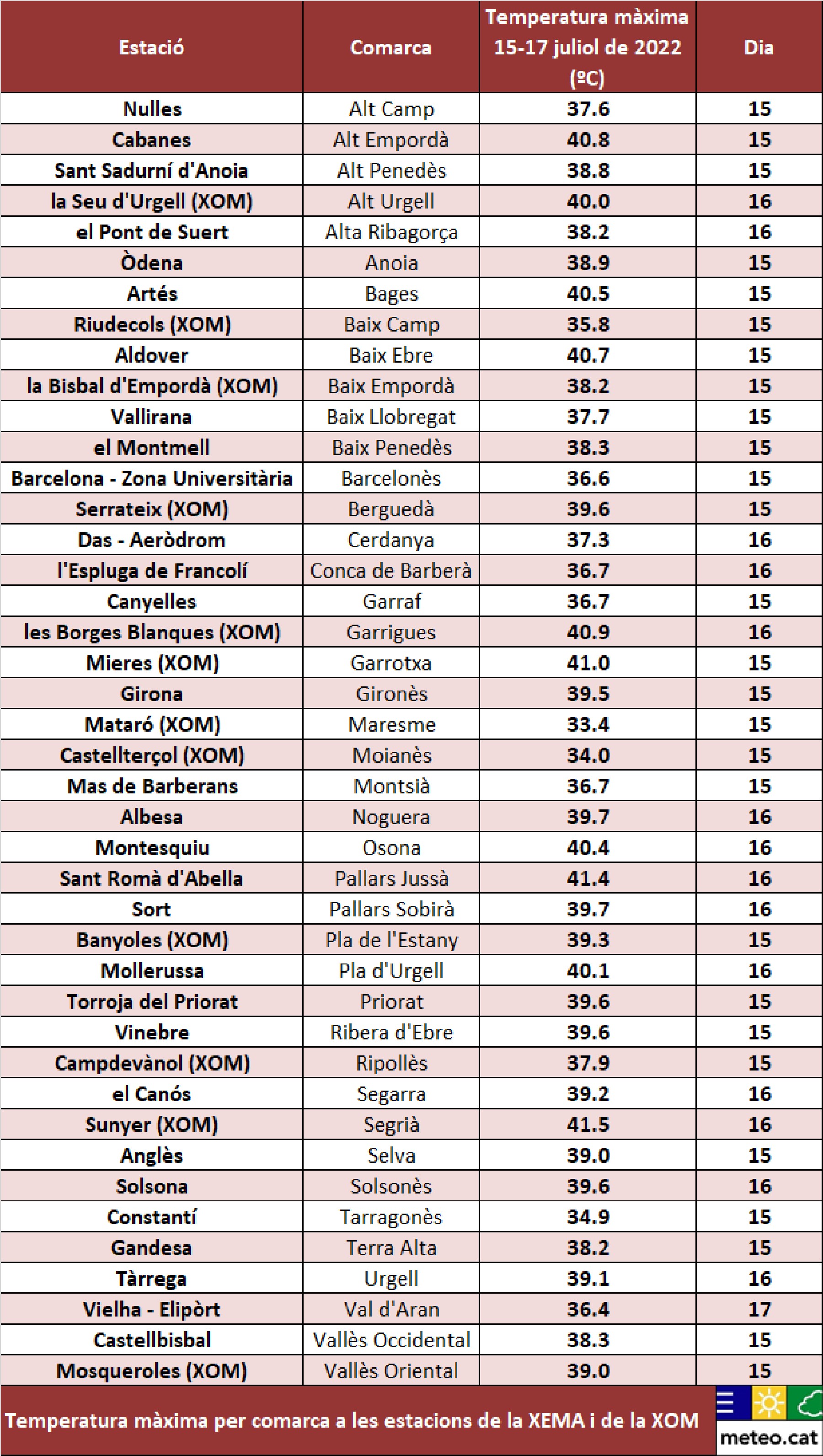 Entre el 15 i el 17 de juliol, 11 de les 152 estacions amb més de 10 anys de dades han mesurat la seva temperatura mínima més alta en un mes de juliol, però cap d'elles de tota la sèrie. El dia que es van superar més rècords de temperatura mínima elevada va ser el dissabte, en set estacions: el Montmell (Baix Penedès), Santa Coloma de Queralt (Conca de Barberà), Sasseuva (Val d'Aran) a 2.228 metres, Espot (Pallars Sobirà), a 2.519 metres, Badalona i Barcelona al Raval i la Zona Universitària.