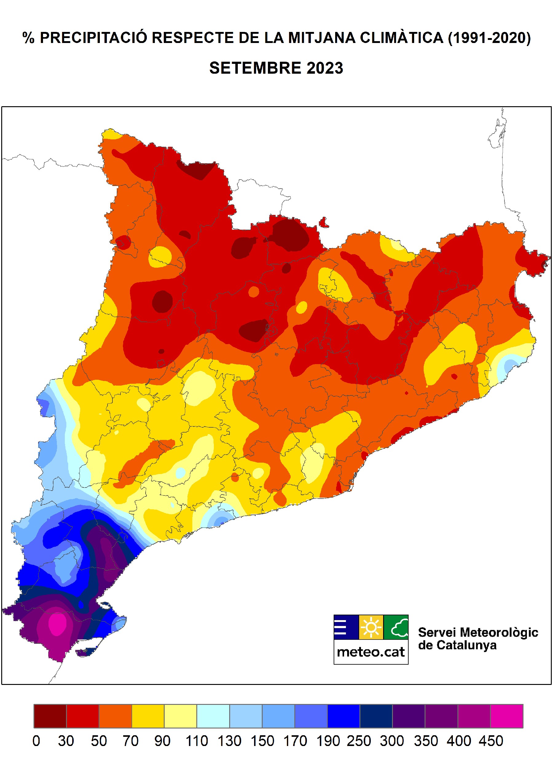 Catalunya ha tancat un dels setembres més càlids de les últimes dècades, sobretot pel que fa a les àrees del Pirineu i Prepirineu, i especialment a les parts més elevades del Pirineu occidental i la Vall d'Aran. Segons ha informat el Servei Meteorològic de Catalunya (SNC), en aquests indrets les temperatures han superat en 2,5% la mitjana climàtica. En general ha estat un mes sec, tot i que s'han registrat precipitacions significatives al litoral i prelitoral sud, a Lleida i al Baix Empordà. Així, la característica principal del mes ha estat una ondulació marcada del corrent en jet, que va provocar pertorbacions i aiguats en alguns punts de Catalunya entre el dissabte 2 i el diumenge 3 de setembre, sobretot a les Terres de l'Ebre.