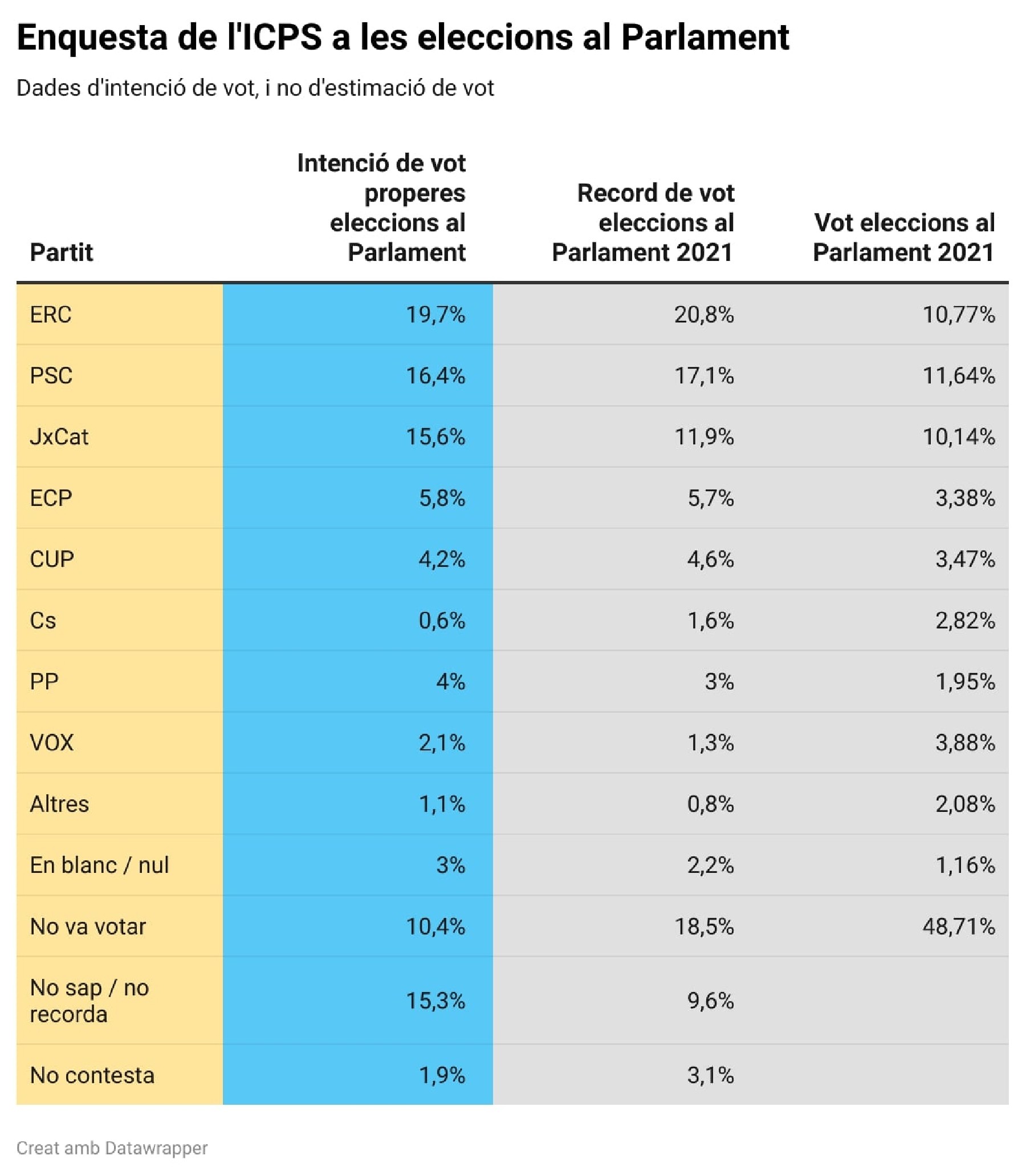 Esquerra seria primera en intenció de vot a les eleccions al Parlament per davant del PSC, segons el sondeig de l'ICPS. El 53,7% dels enquestats creu que el procés acabarà amb un acord amb Espanya per dotar Catalunya de més autogovern