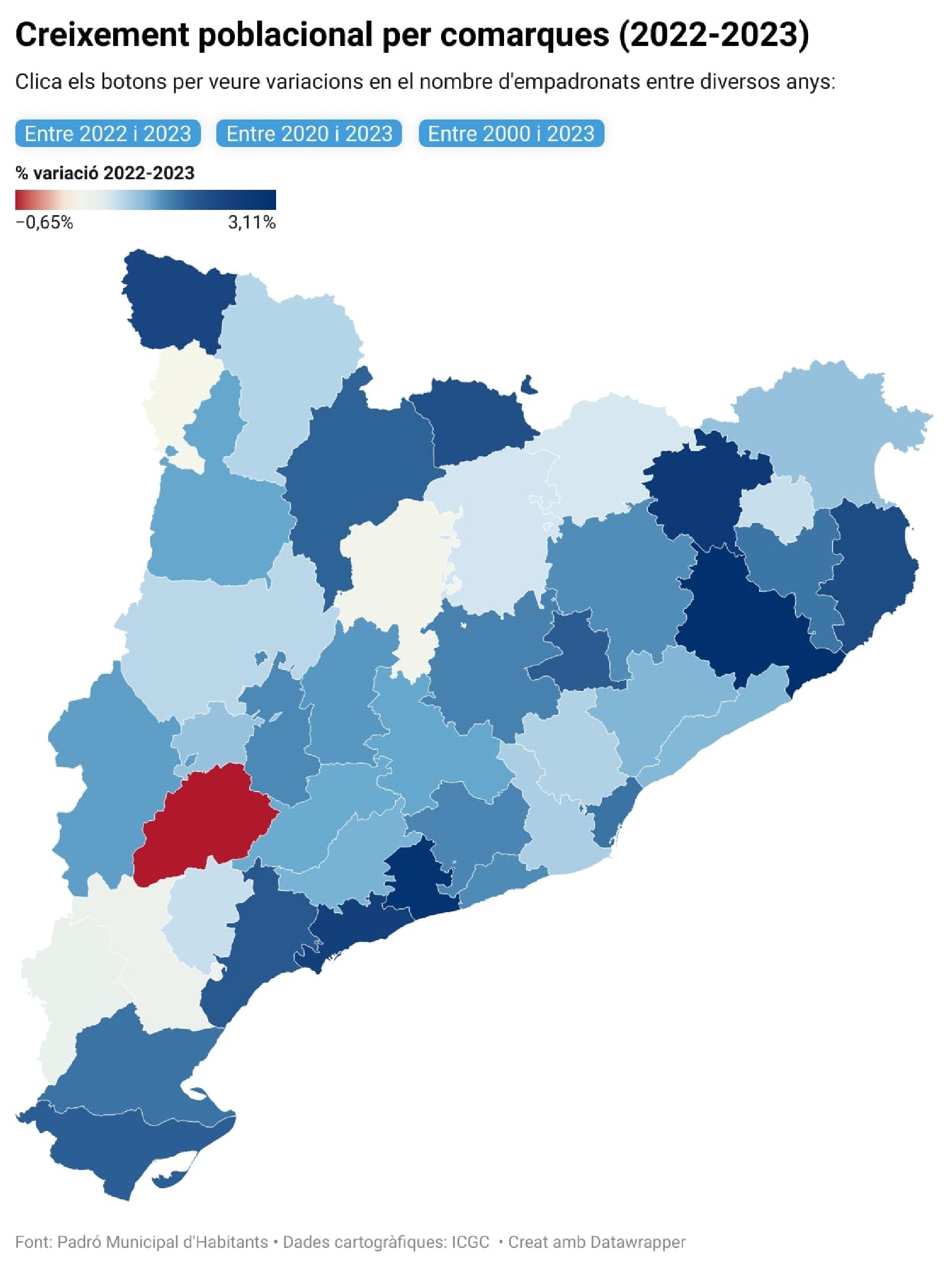 Les Garrigues, l'única comarca que perd empadronats en l'últim any. Platja d'Aro, Lloret de Mar i Calafell són els municipis de més de 2.000 habitants que més pugen de població