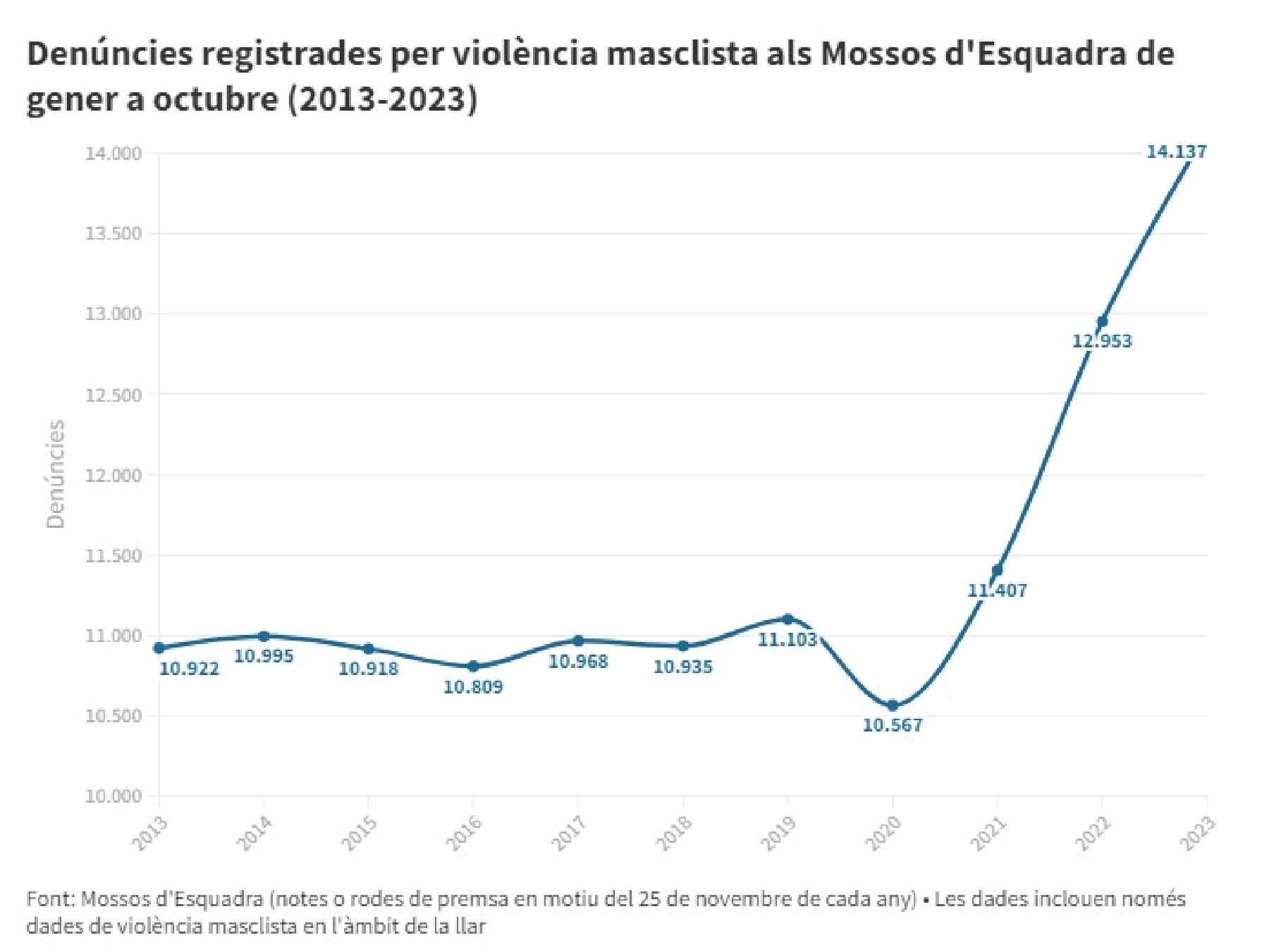Les denúncies per violència masclista a la parella augmenten a Catalunya un 10% i les detencions un 13% respecte el 2022. L'assetjament creix un 62%, els delictes sexuals, un 38%, i els trencaments de condemna, un 17%