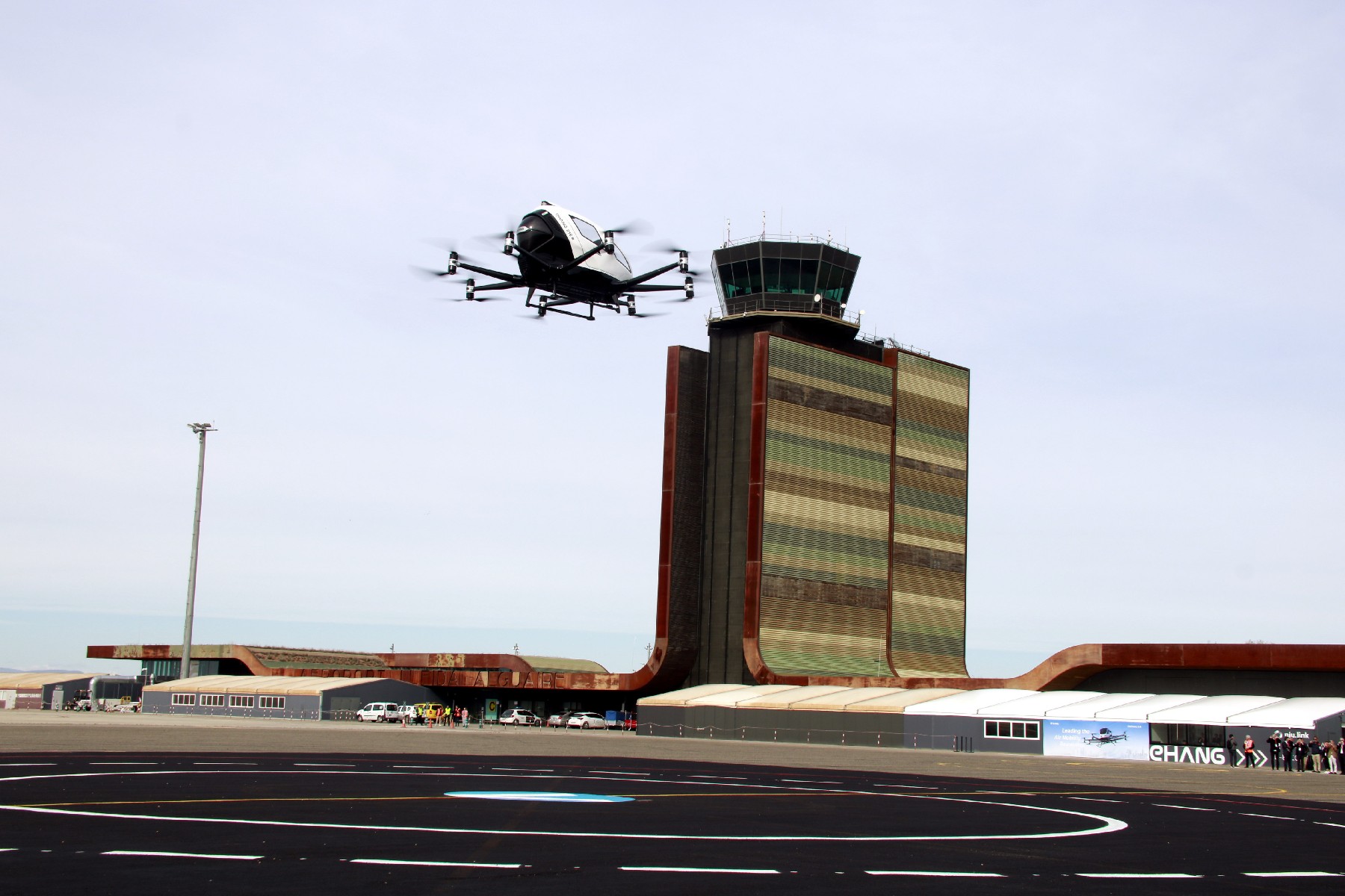 L'empresa xinesa EHang inaugura a l'aeroport de Lleida-Alguaire la primera base de vehicles aeris autònoms d'Europa. La firma utilitzarà les instal·lacions per testejar cotxes voladors i promoure aquesta indústria