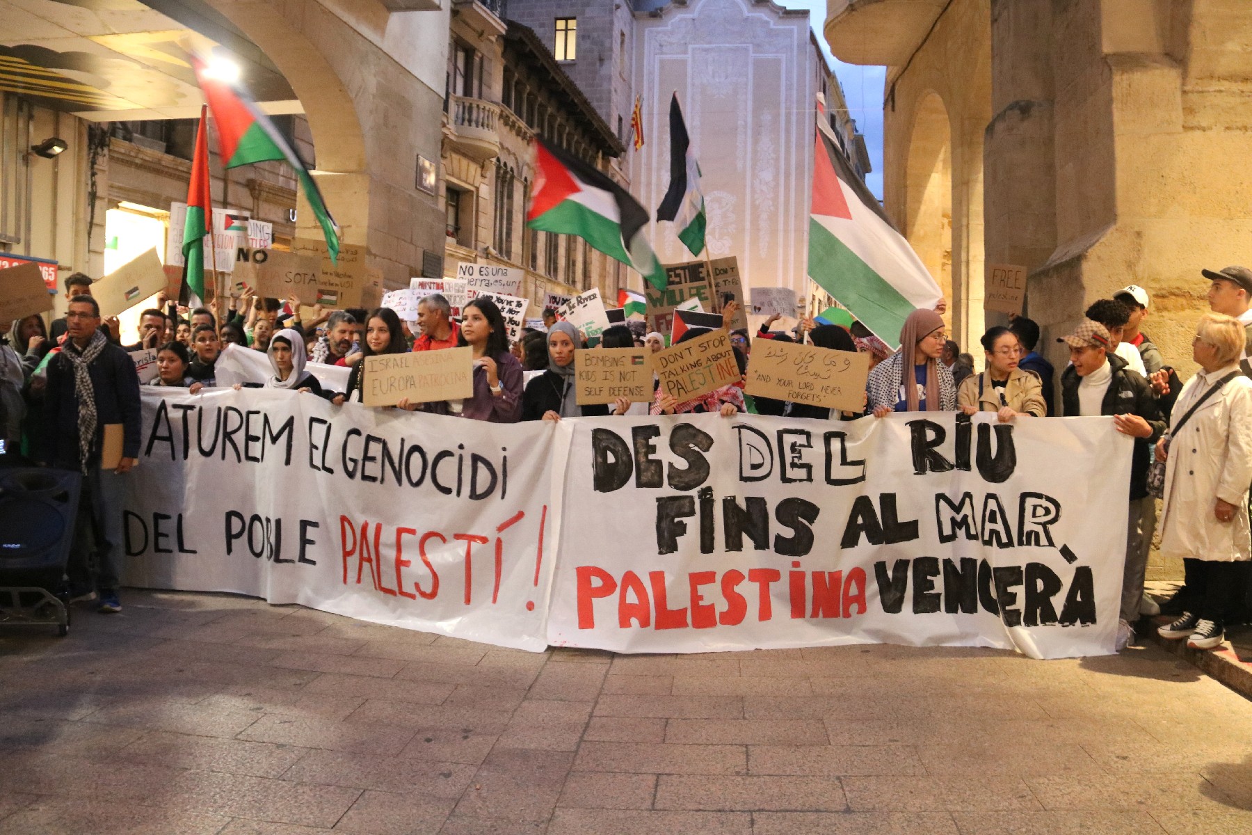 Centenars de persones es manifesten a Lleida per denunciar 'un genocidi al poble de Palestina' i reclamar un alto al foc. Amb pancartes criticant la resposta de la UE, els manifestants han cridat consignes com 'Israel ocupa i assassina'