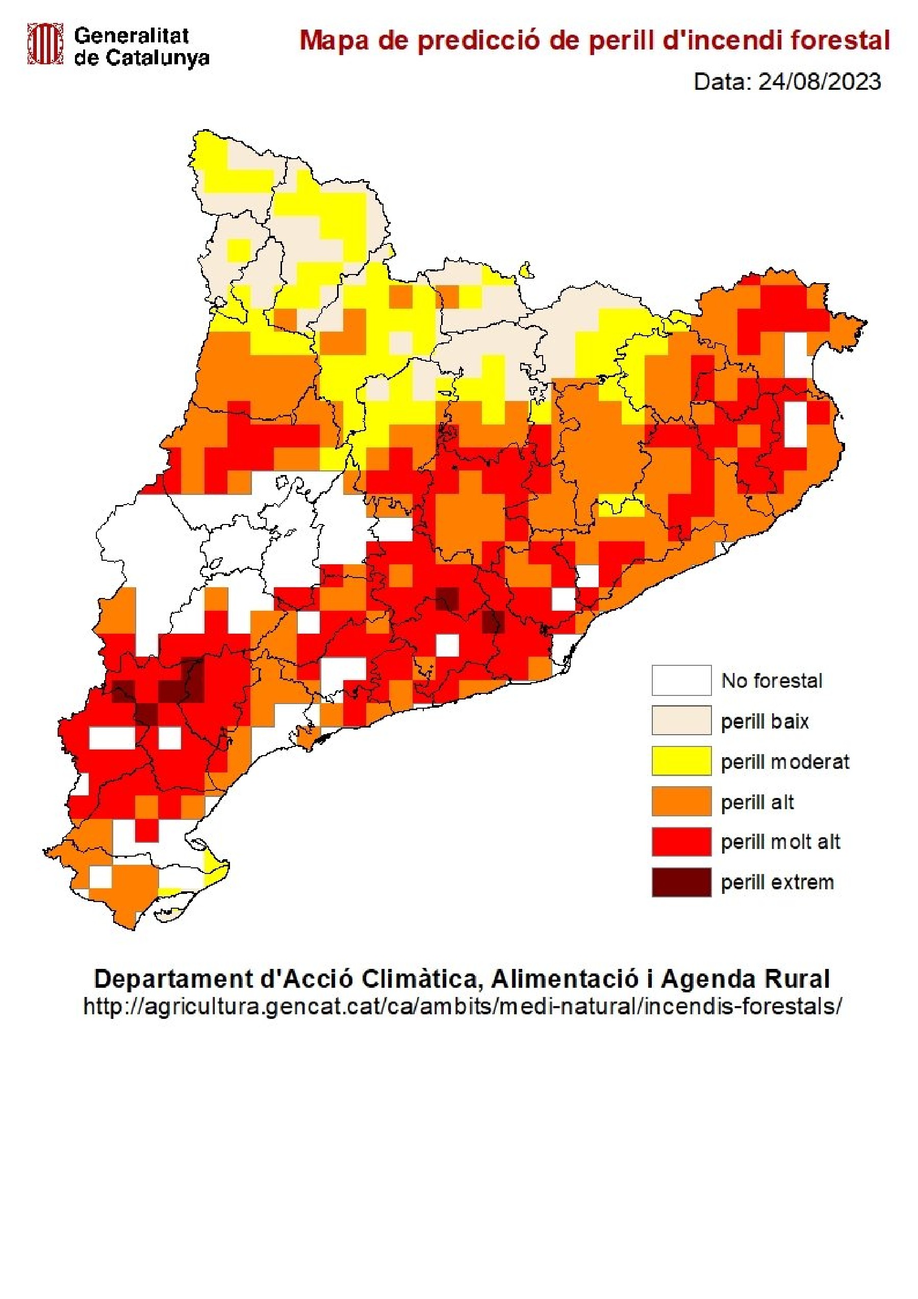 Una trentena de comarques de Catalunya es troben en risc alt o molt alt d'incendi forestal. Durant la jornada d'ahir es van assolir pics de temperatura de fins a 40 graus