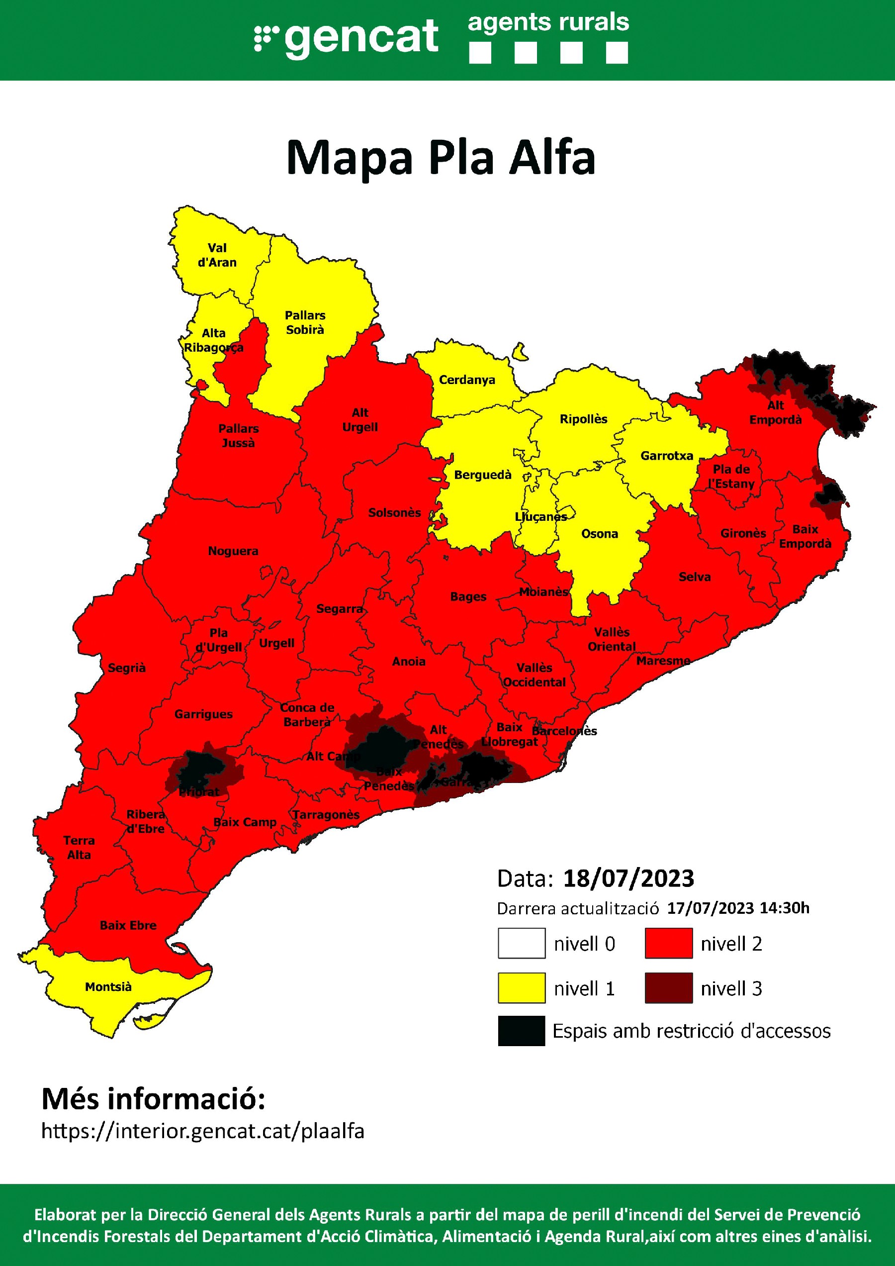 Tallen els accessos a sis espais naturals protegits de Catalunya per perill d'incendi aquest dimarts. Els Agents Rurals activen el nivell 3 del Pla Alfa a 57 municipis de 8 comarques a partir d'aquesta mitjanit