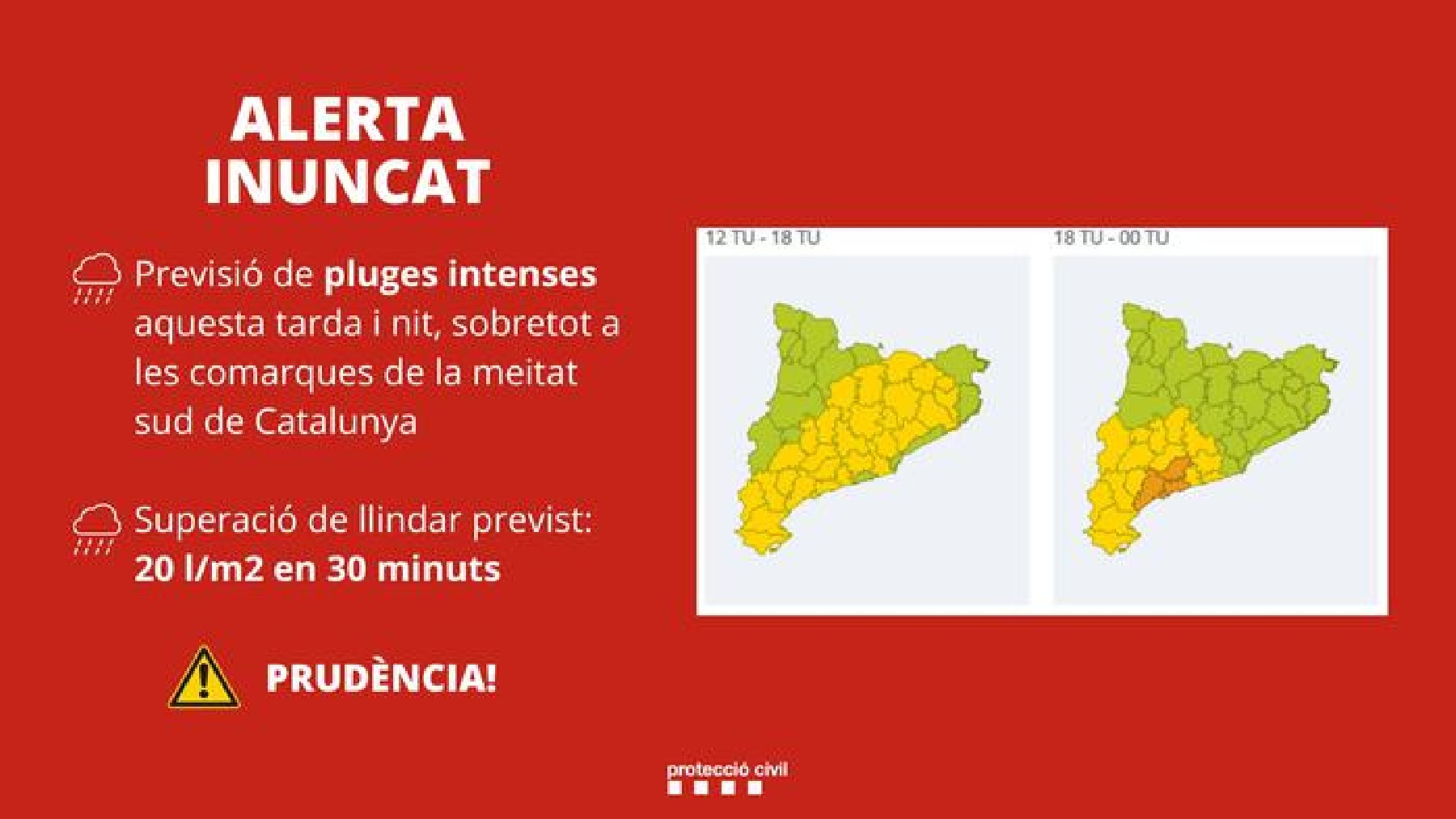 Protecció Civil activa l'alerta del pla l'INUNCAT per la previsió de pluges intenses aquesta tarda i nit