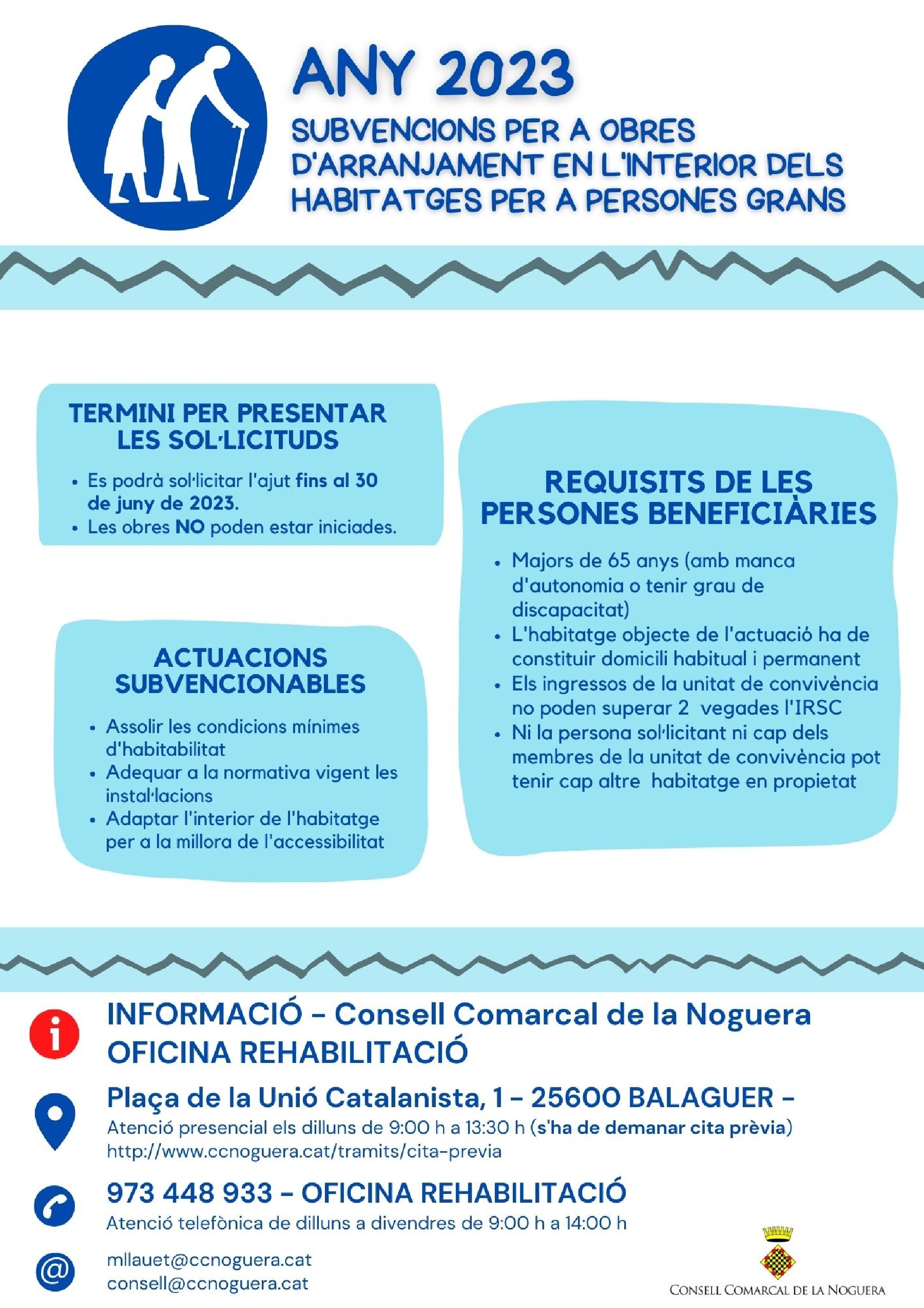 Convocatòria 2023 d'ajuts per adaptar habitatges de persones grans, amb discapacitat i/o situació de dependència. Per a més informació i assessorament, es pot contactar amb l'Oficina d'Habitatge del Consell Comarcal de la Noguera
