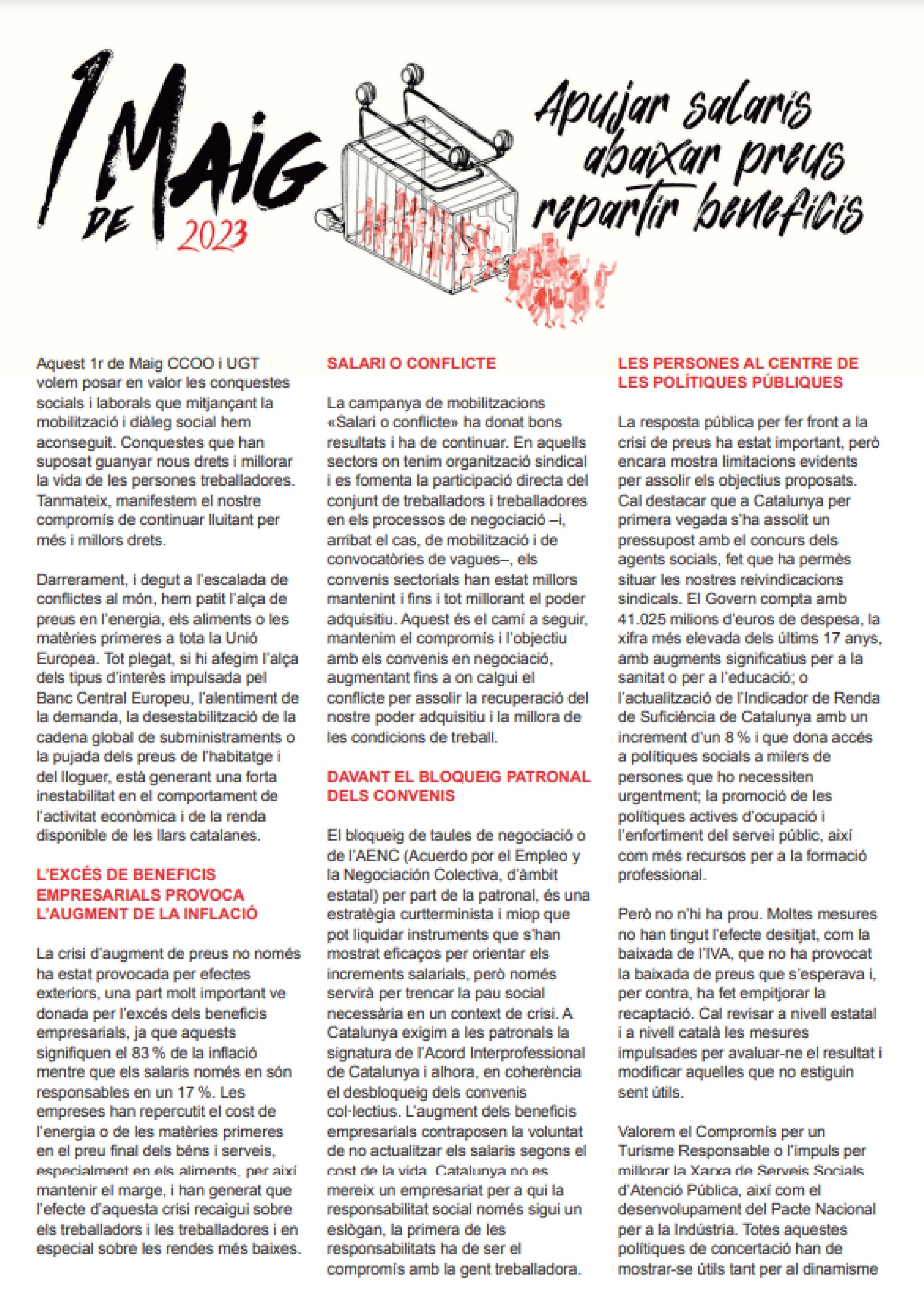 CCOO i UGT exigeixen augments de sou per afrontar la inflació en un manifest conjunt per l'1 de maig. Els sindicats majoritaris avisen: 'Apujar salaris, abaixar preus i repartir els beneficis'