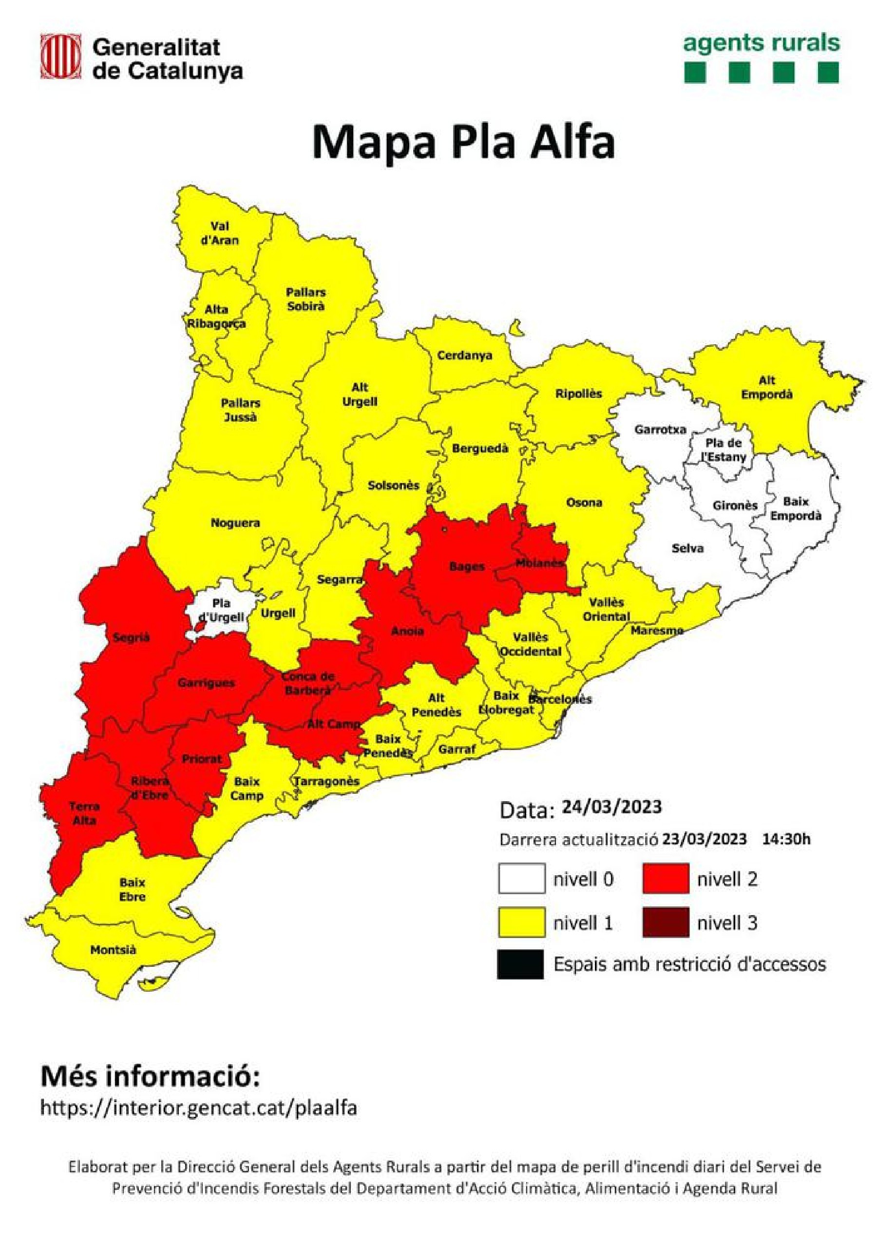 Risc alt d'incendi forestal a 31 comarques de Catalunya a partir d'aquesta mitjanit. Se suspenen 2.400 activitats a 277 municipis i els Agents Rurals fan una crida a extremar la precaució