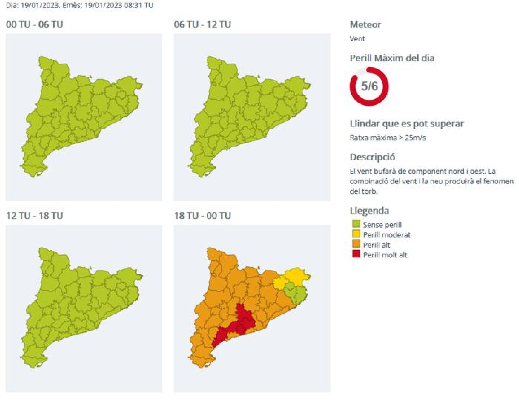 Protecció Civil activa l'alerta del plans Ventcat i Nuecat i demana prudència davant del nou episodi de vent, neu i fred. Les comarques més afectades per la ventada seran l'Anoia, l'Alt i el Baix Penedès i el Baix i l'Alt Camp