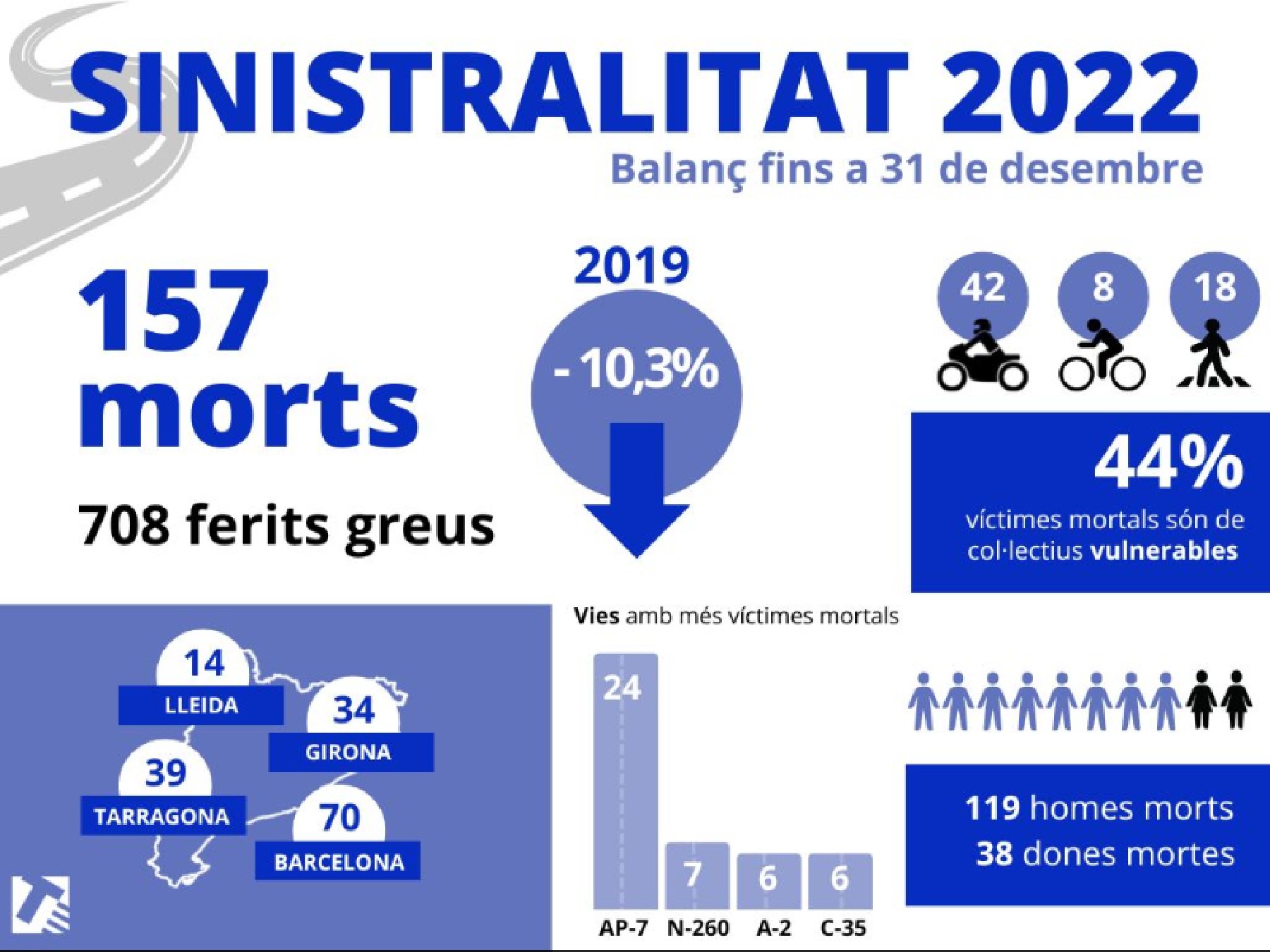 Catalunya tanca el 2022 amb 157 morts a les carreteres, un 10% menys que el 2019. Per demarcacions, 70 morts s'han produït a Barcelona, 39 a Tarragona, 34 a Girona i 14 a Lleida. L'AP-7 aglutina el 15% de les víctimes amb un total de 24