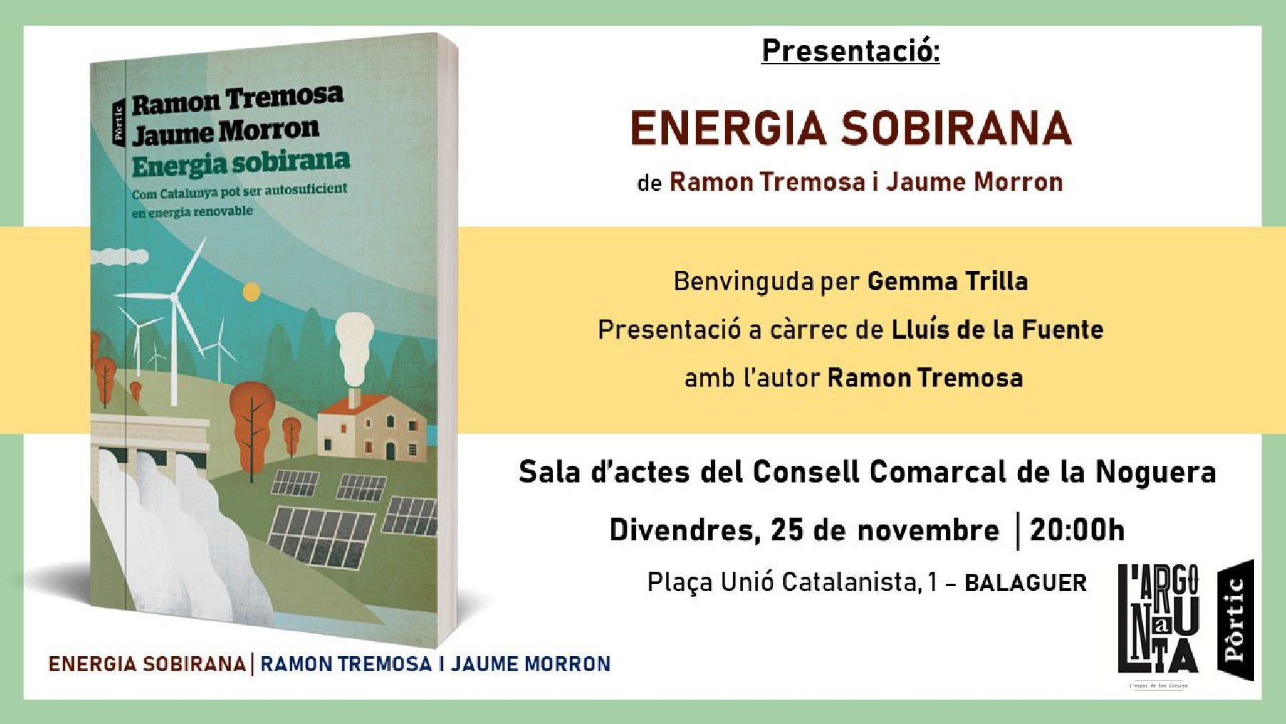 Ramon Tremosa presenta a Balaguer el seu darrer llibre 'Energia sobirana. Com Catalunya pot ser autosuficient en energia renovable' La presentació tindrà lloc divendres 25 a les 20h a la sala d'actes del Consell Comarcal de la Noguera