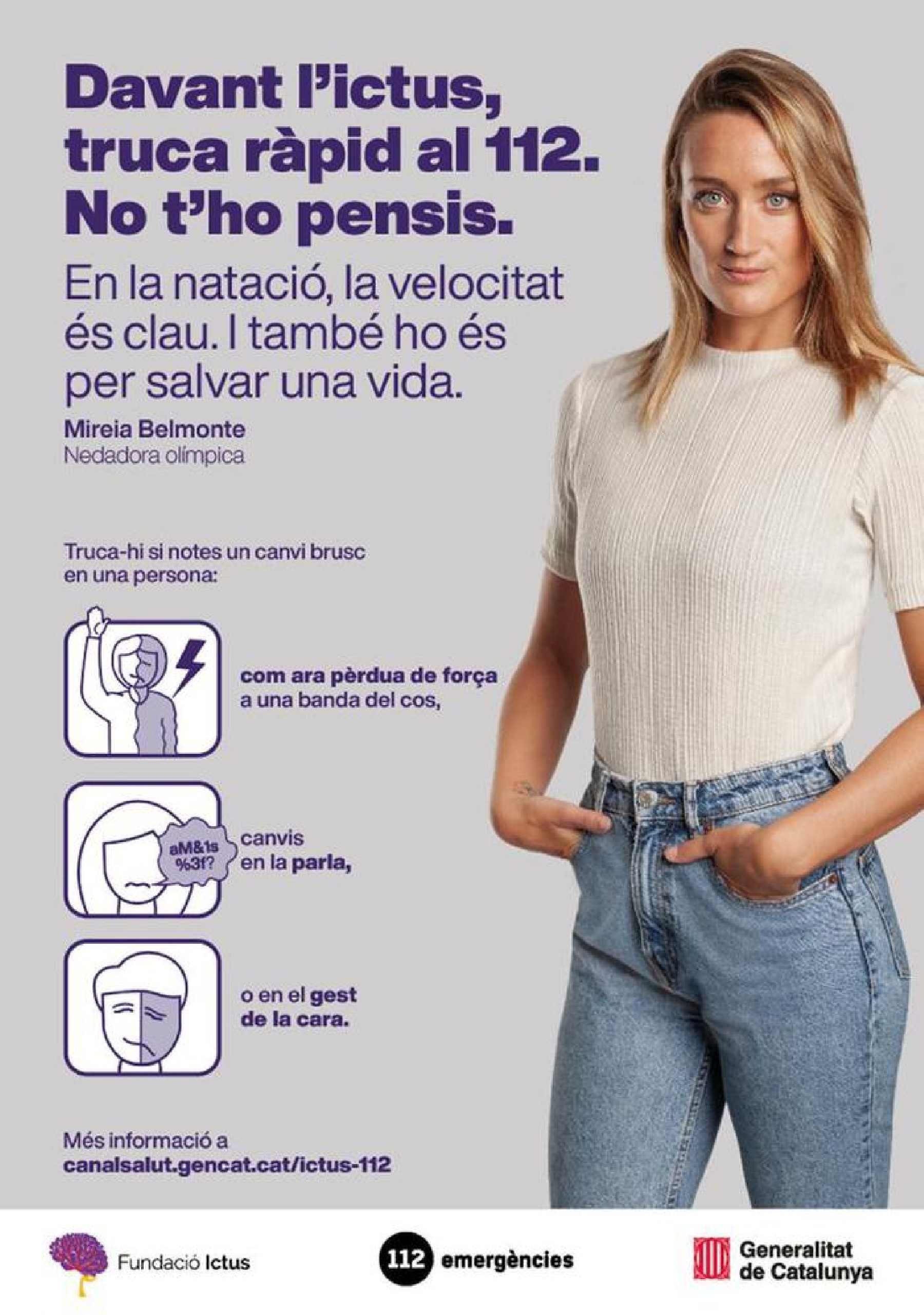 Campanya de Salut perquè es truqui ràpidament el 112 davant la sospita d'ictus. Mireia Belmonte protagonitza l'espot que posa l'accent en ensenyar a la població com reconèixer els símptomes