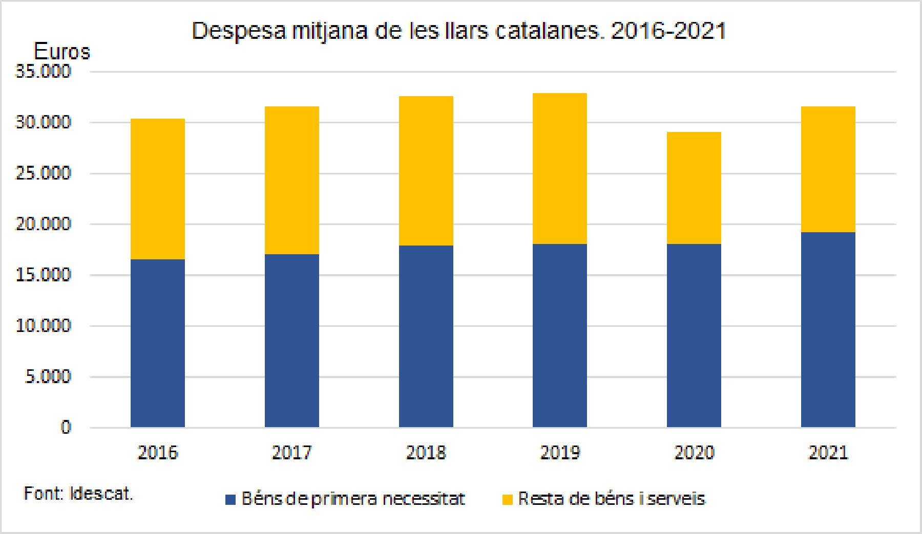 La despesa mitjana de les llars del 2021 no recupera els nivells precovid tot i créixer un 8,5% anual. Respecte al 2019, creix un 5,7% els diners gastats en béns de primera necessitat i s'enfonsa un 15,3% la resta