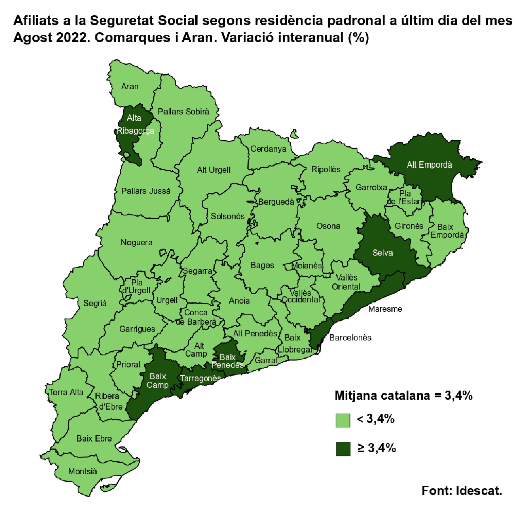 Els afiliats a la Seguretat Social augmenten a tot el territori a l'agost excepte a 3 comarques, el Pallars Sobirà, les Garrigues i la Noguera, en relació amb l'any anterior