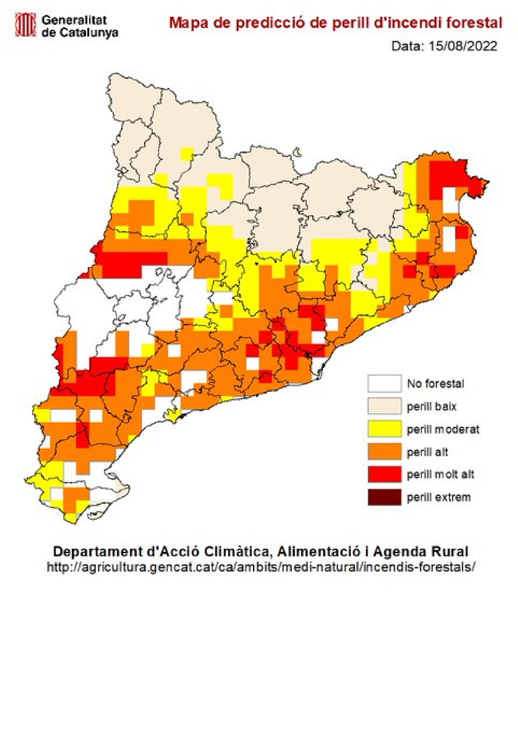 L'alerta màxima per risc d'incendi i altes temperatures el cap de setmana s'estén a 249 municipis de 23 comarques. Interior fa una crida a la ciutadania per extremar les precaucions davant d'un episodi 'excepcional'